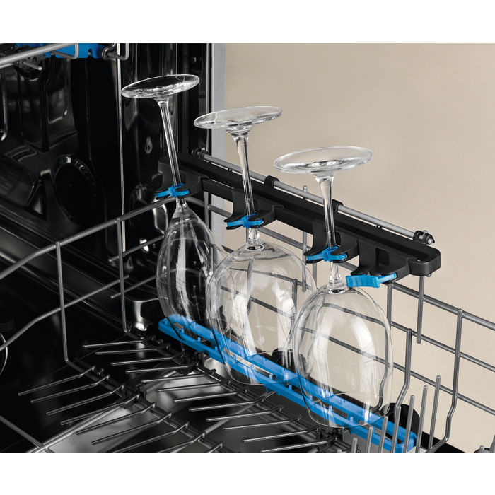 Додаткова зручність надають регульований верхній кошик з функцією FlexiLift та захист від протікань, що гарантує безпеку використання. Функція AirDry забезпечує ефективне сушіння, а індикатори солі та ополіскувача дозволяють контролювати необхідність дозаправки. Посудомийна машина також використовує всього 9.9 літра води на один цикл програми Eco.