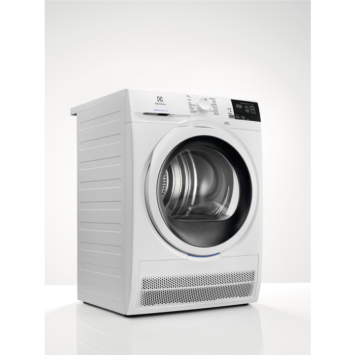 Ця конденсаційна сушильна машина не вимагає зовнішньої вентиляції, оскільки волога конденсується в спеціальному контейнері, в результаті чого забезпечує простоту в установці. Всі етапи сушіння відстежуються за допомогою електронного сенсора, який визначає вологість тканини, забезпечуючи оптимальний рівень сушіння. Після завершення програми білизна не тільки суха, а й свіжо пропрасована завдяки функції антизгинання.