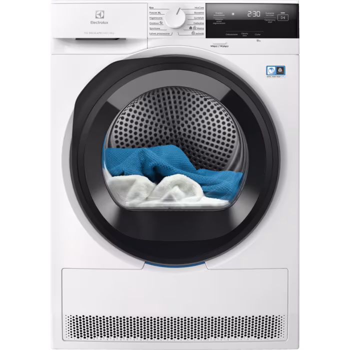 Сушильна машина має білій LED-дисплей і інтуїтивно зрозуміле керування, що робить процес експлуатації простим і зручним. Крім базових програм, таких як MixCare, бавовна та делікатний, ви також знайдете спеціалізовані режими для шовку, вовни та спортівного одягу.