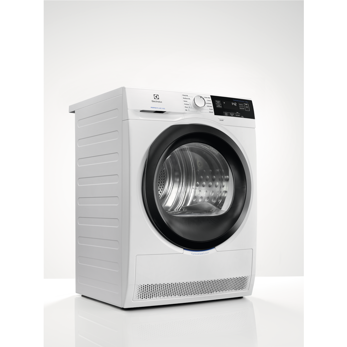 Сушильна машина має зручний інтерфейс, три індикатори: наявність фільтра, ємність та конденсатор, а також внутрішнє освітлення для оптимальної видимості всередині. Запатентована технологія Protex запобігає пошкодженню речей, а місткий конденсаційний бак об’ємом 5.32 л легко витягується для очищення.