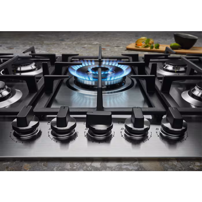 Управління конфорками розташоване спереду, що забезпечує зручність під час приготування їжі. Плита має продуману конструкцію з чавунними опорами для варильної панелі, що надає їй додаткову стабільність та витривалість. Модель прекрасно підходить для приготування різних страв завдяки своїй різноманітності конфорок: від потужної Multicrown WOK Burner до допоміжної конфорки потужністю 1000W.