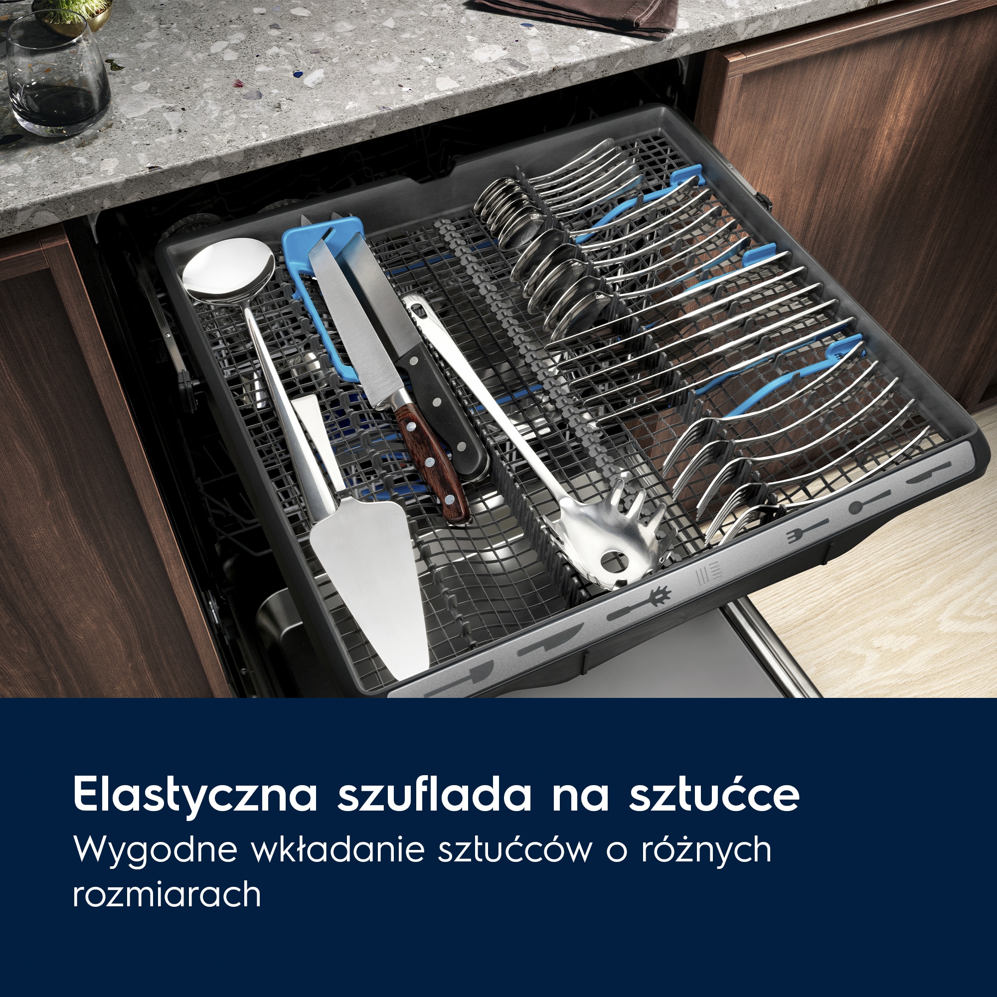 Особливістю Electrolux KEMC8321L є система TimeBeam, яка показує залишок часу до завершення циклу на підлозі, а також функція AirDry, що забезпечує оптимальне сушіння. Зручність використання доповнюється сенсорним керуванням і можливістю регулювання верхнього кошика за допомогою FlexiLift.