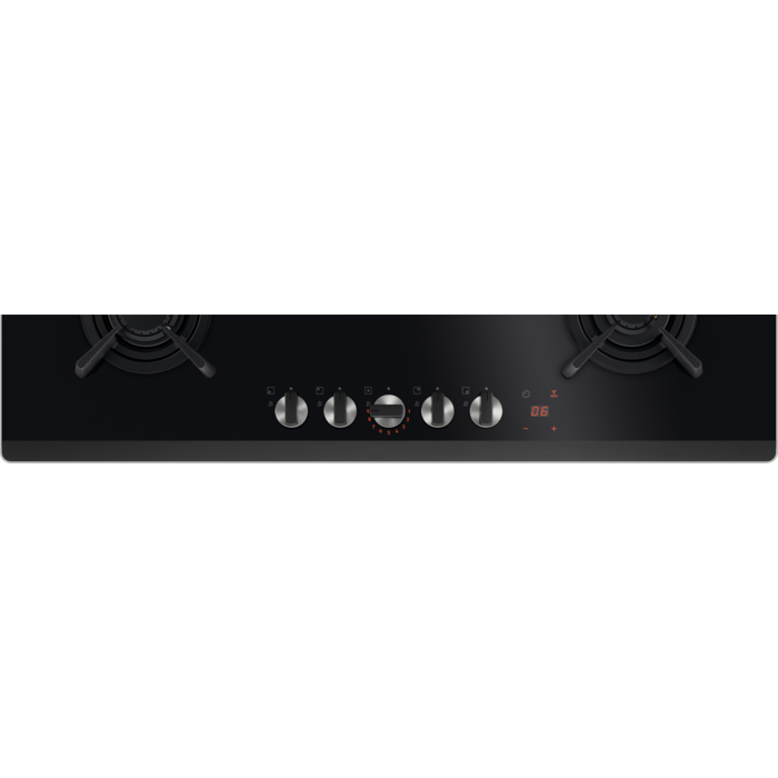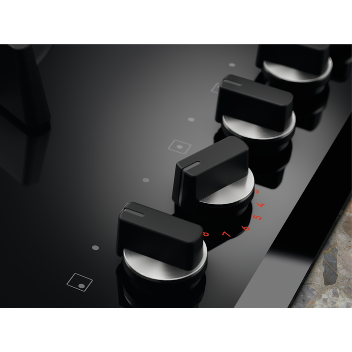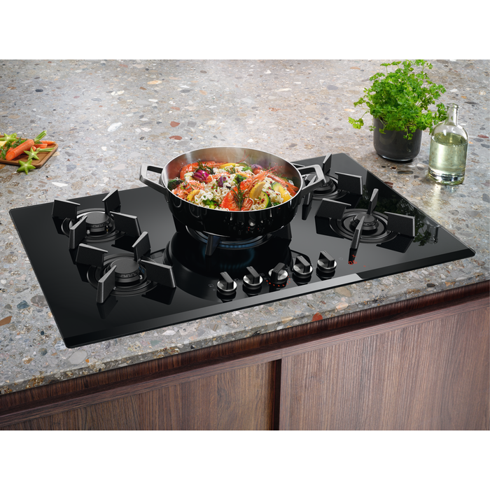 Модель має 5 газових конфорок на скляній поверхні, що дозволяє готувати різноманітні страви одночасно. Кожна зона має свою потужність, наприклад, вертикальне полум'я для швидкого нагрівання чи потужну конфорку для використання воку. Індикатор стану полум'я допомагає контролювати рівень газу під час готування, забезпечуючи безпеку та комфорт.