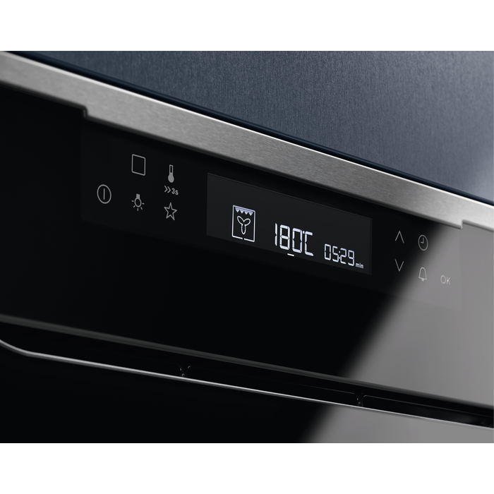 Ваша безпека є пріоритетом: духовий шкаф оснащений системою безпеки, яка активує охолоджуючий вентилятор при відкритті дверей, а також попереджує про залишкове тепло. З електронним управлінням ви зможете з легкістю контролювати готування, а автоматичні пропозиції температури допоможуть знайти оптимальні налаштування для кожної страви.