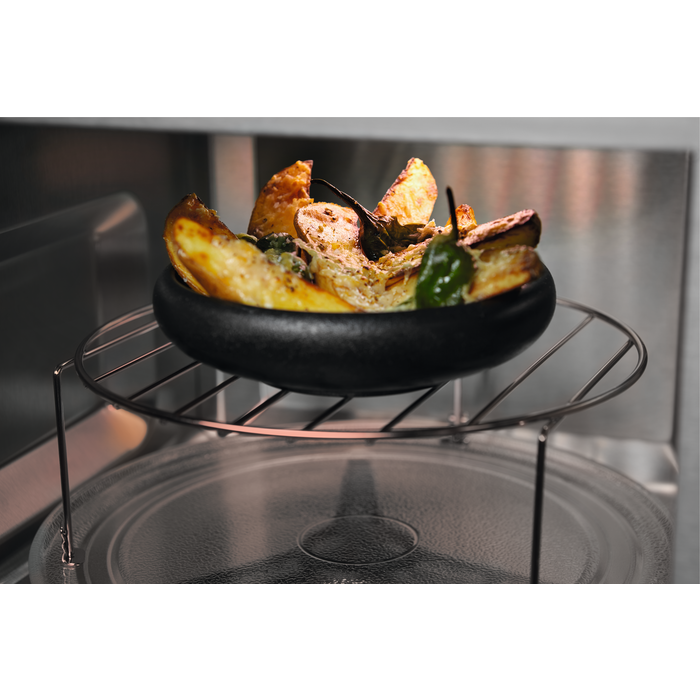 Модель також має електронний таймер із функцією годинника, що дозволяє зручно відстежувати час приготування. Її скляний обертамий диск діаметром 270 мм забезпечує рівномірне приготування їжі, а додатковий стійка доповнює комплект поставки. Внутрішня частина виконана з нержавіючої сталі, що забезпечує легке очищення і витривалість у використанні.
