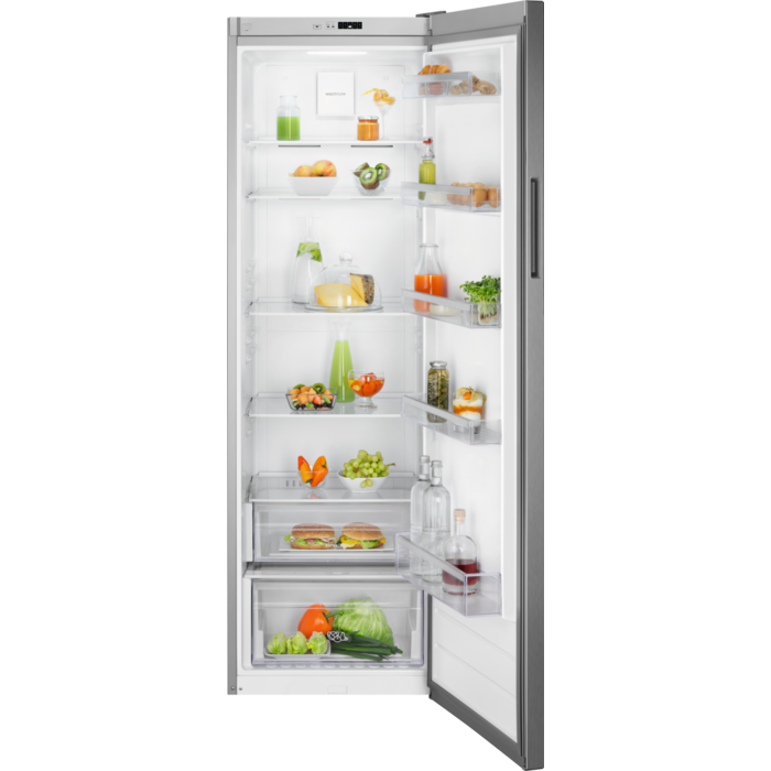 Керування температурою здійснюється через електронну панель з світлодіодними індикаторами, що дозволяє легко контролювати стан усередині приладу. Холодильник оснащений четирма полицями та однією шухлядою для зручного зберігання продуктів, а також має дві відкриті полички для пляшок.