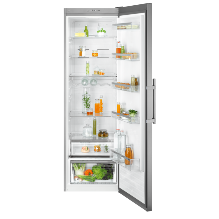 Холодильник також оснащений автоматичним розморожуванням, що спрощує обслуговування, а дворічний звукoвий та візуальний сигнал забезпечує безпечне використання при відкритих дверцятах. Комфорт використання доповнюється чотирма полицями повної ширини та однією шухлядою для зберігання ваших улюблених продуктів.