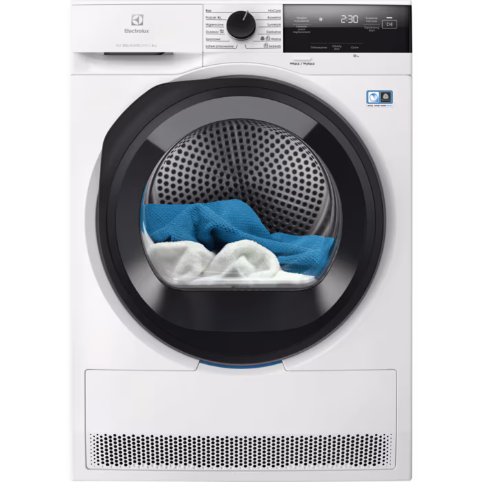 Сушильна машина обладнана **системою сенсорного контролю**, яка автоматично визначає ступінь вологості вашого одягу. Ви також зможете вибрати зручні програми сушіння, серед яких: **MixCare**, **дбайливе сушіння**, та **економічна програма Eco**. Завдяки **внутрішньому освітленню** ви зможете легко моніторити процес сушіння, а інтуїтивно зрозумілий **білий LED дисплей** відображає статус роботи машини.