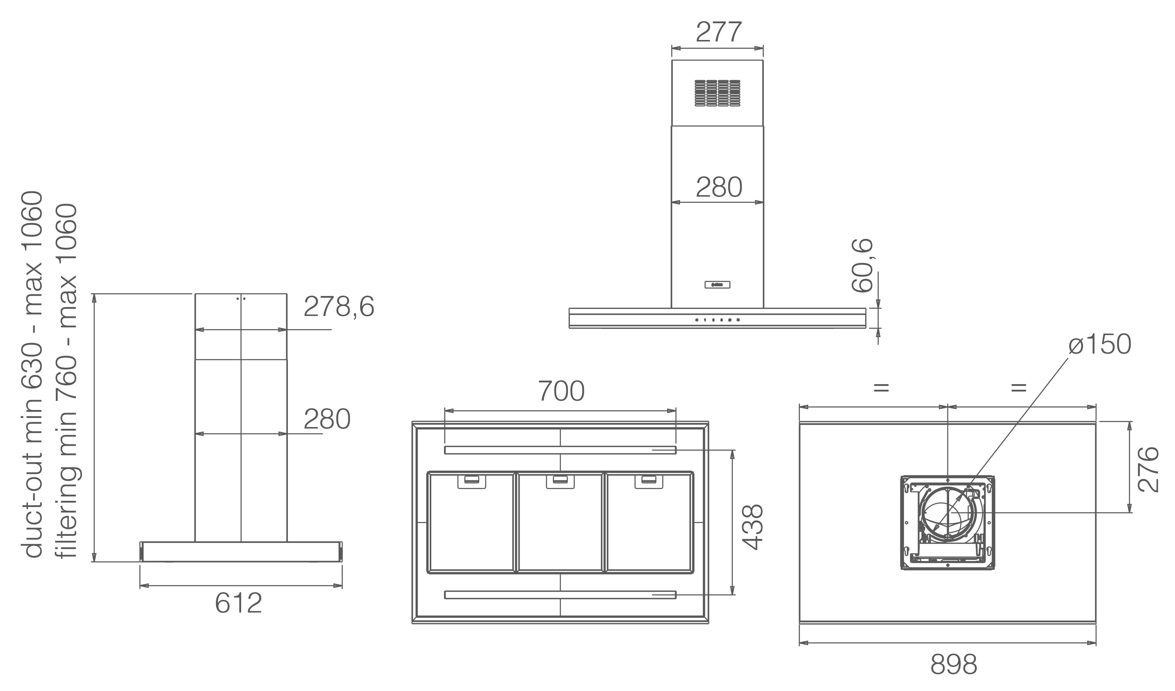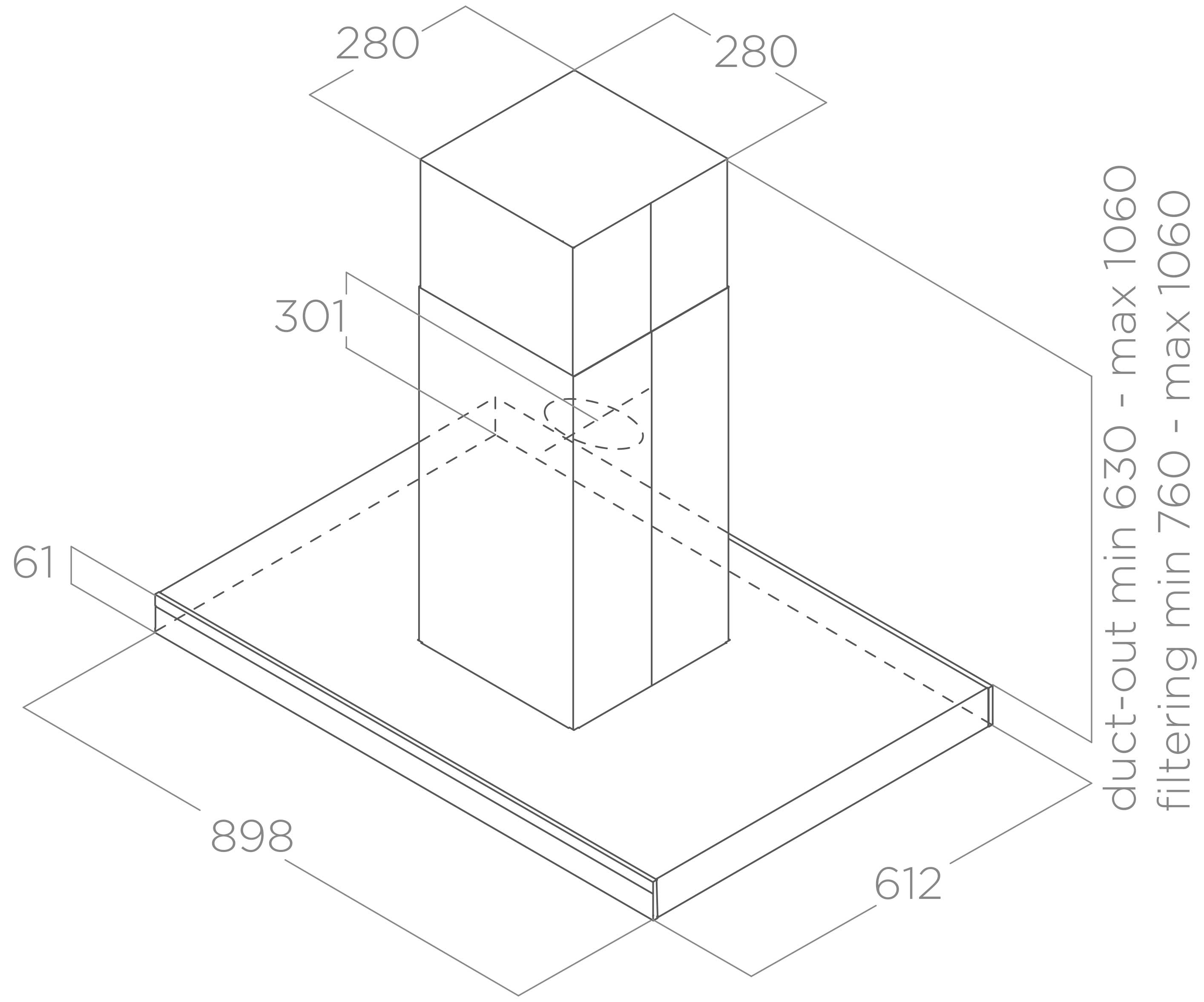 З невеликим розміром та елегантним дизайном, Elica Adéle Island має ширину 90 см, виготовлена з нержавіючої сталі та чорного скла. Вона забезпечує потужність від 325 до 770 м³/h, з рівнем шуму від 55 до 69 дБ. Це робить витяжку ефективною навіть у великих кухнях.