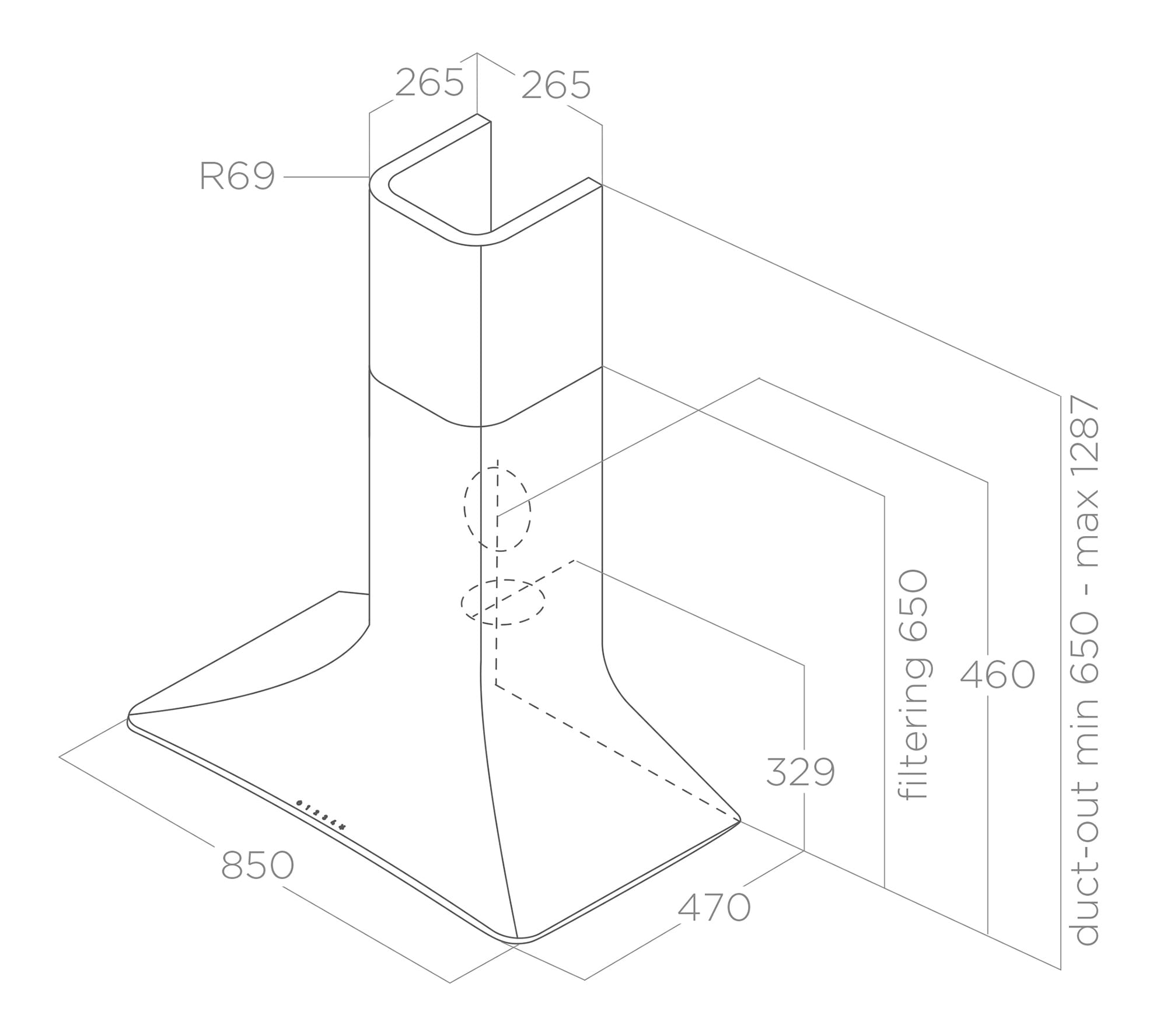Витяжка працює на енергоефективному класі A, що допоможе знизити витрати на електроенергію. Вона має мінімальну відстань від стіни: 60 см для індукційних та радіантних плит, а також 70 см для газових. Транспортування повітря здійснюється через дюк 150 мм, що забезпечує ефективну циркуляцію.