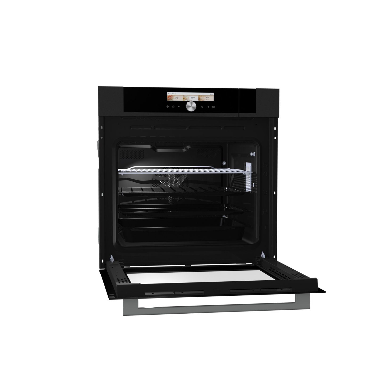 Духова шафа також має інноваційний температурний зонд, що дозволяє точно контролювати приготування м'яса. Внутрішня камера виготовлена з піролітичної емалі SilverMatte, що забезпечує легкість очищення і стійкість до високих температур.