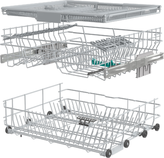Завдяки конструкції з трьома кошиками, вона може вмістити до 16 комплектів посуду. Регульована третя полиця служить для столових приборів, а MultiClack дозволяє налаштувати висоту середнього кошика для зручного завантаження.