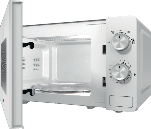 Управління мікрохвильовою піччю здійснюється через механічні поворотні ручки, що робить експлуатацію зручною і зрозумілою. Система обертальної тарілки забезпечує рівномірний розподіл мікрохвиль, сприяючи якісному приготуванню їжі.