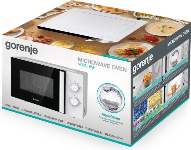 Гарною особливістю Gorenje MO20E1WH є автоматичне очищення за допомогою технології AquaClean. Просто заповніть чашку водою, запустіть програму AutoClean, і піч очиститься без потреби у хімічних засобах. У внутрішній камерi використана емаль, що забезпечує легкість у догляді за приладом.