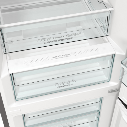 Однією з ключових особливостей є система AdaptTech, яка постійно контролює температуру всередині холодильника, забезпечуючи оптимальний режим роботи. А з функцією CrispZone з SmartHumidity ваші овочі та фрукти залишаться свіжими і хрусткими завдяки автоматичному регулюванню вологості.