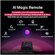 Саунд-система телевізора видає 20W звуку у форматі 2.0 канали з підтримкою AI Sound для оптимальної якості звуку. У поєднанні з функцією Bluetooth Surround, ви зможете створити потужну систему озвучення у вашому домі. З WebOS 25 ви зможете без проблем насолоджуватися величезним вибором додатків для перегляду контенту.