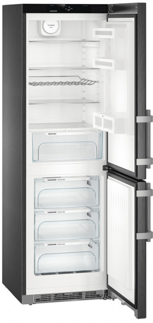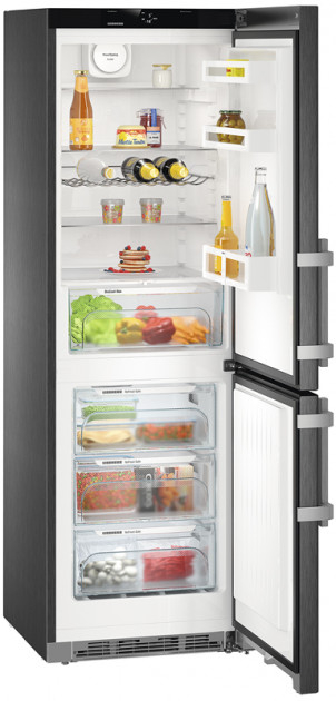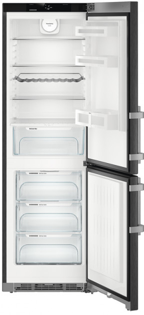 Крім того, Liebherr CNbs 4315 має **сенсорний дисплей** для зручного управління, а **SmartDevice** дозволяє підключати пристрій до смартфону для відстеження його роботи в реальному часі. Наявність **підсвічування LED** та **скляних полок** додає приладу сучасного вигляду.