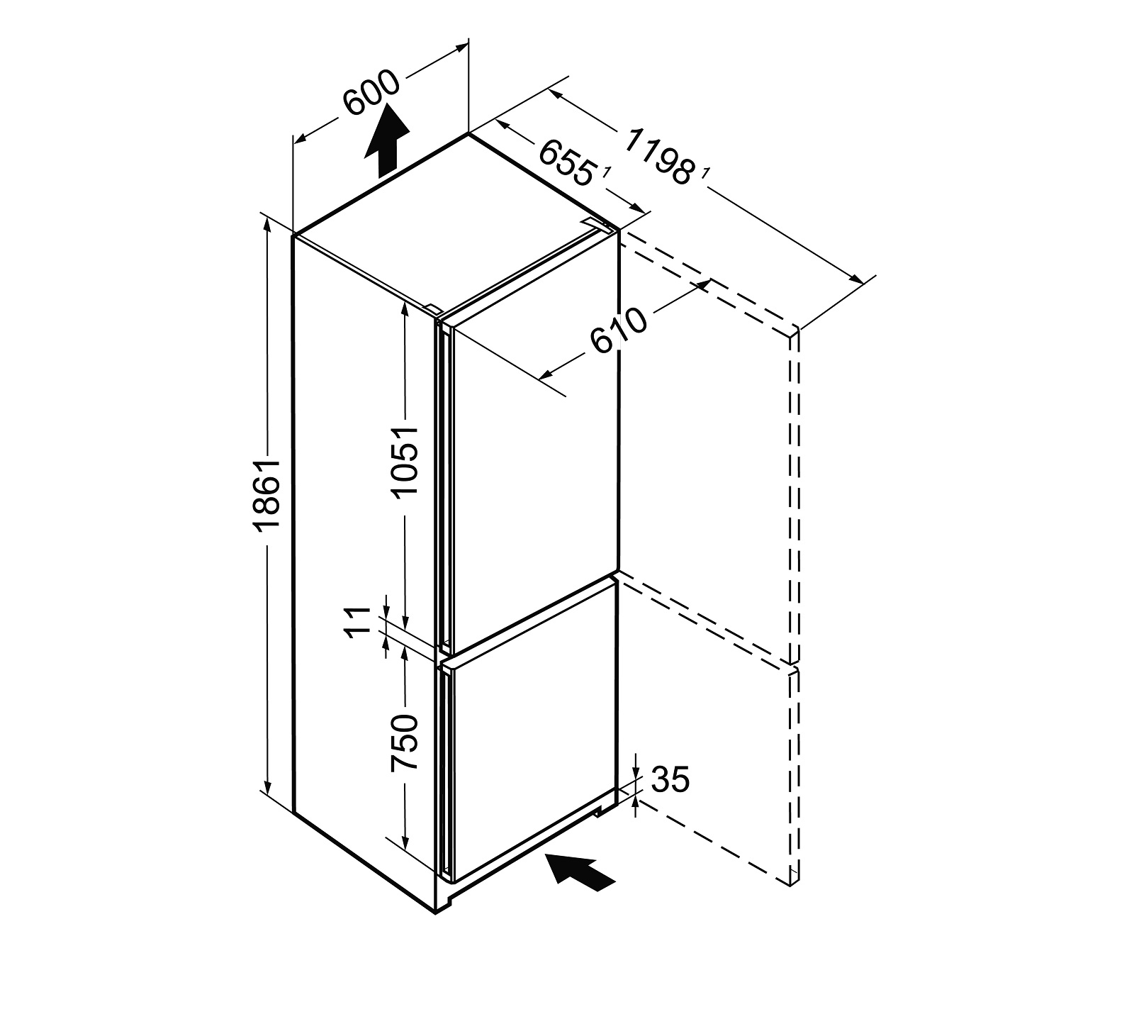 Цей двокамерний холодильник має висоту 186.1 см, ширину 60 см та глибину 65.5 см, що дозволяє йому вписатися у будь-який простір. Об’єм холодильника складає 304 л, зокрема 209 л в холодильній камері та 95 л в морозильній. Регульовані полки і контейнер для овочів покращують організацію простору, а VarioSpace дозволяє модифікувати внутрішній об'єм за потреби.