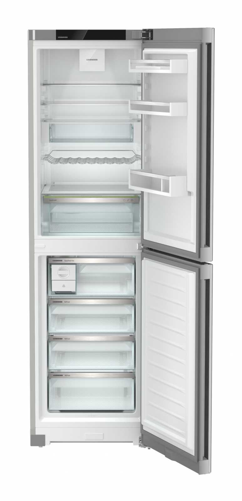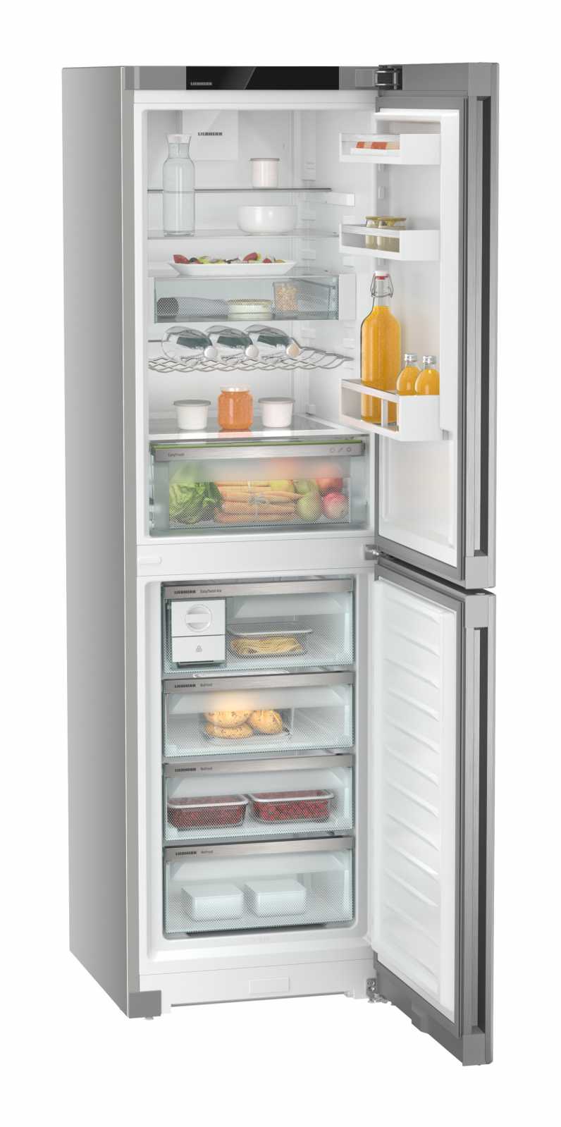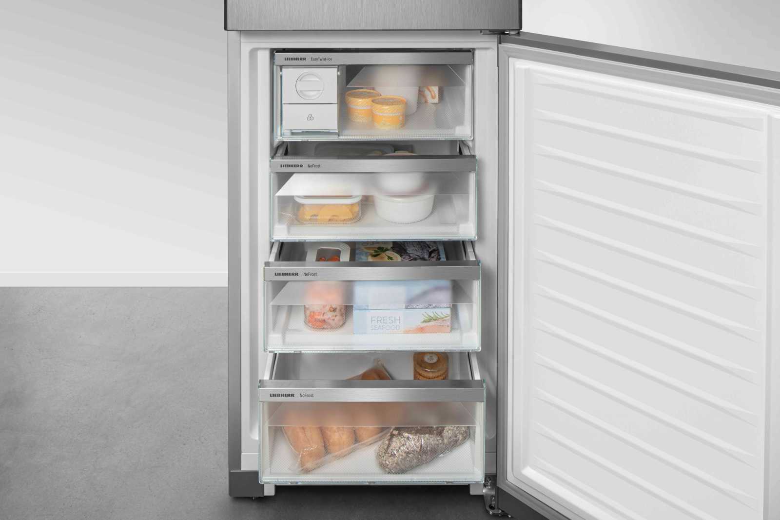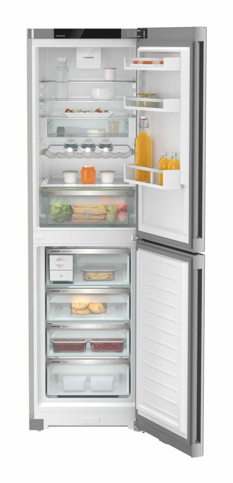 Із загальним об'ємом 383 літри та корисним об'ємом 348 літрів, Liebherr CNsfd 573i Plus оснащений **двоїстим охолодженням DuoCooling**, що дозволяє незалежно регулювати температуру в холодильній та морозильній камерах. **EasyFresh** допоможе зберегти овочі й фрукти свіжими, а функція **SuperCool** швидко охолоджує продукти після покупки.