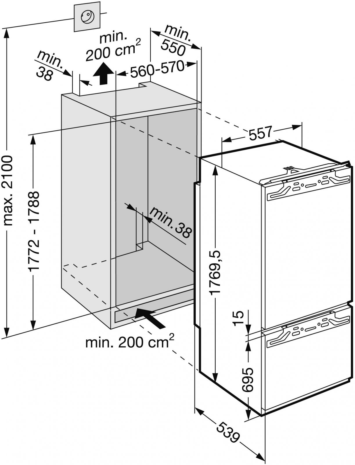 Встраємий комбінований двокамерний холодильник Liebherr ICN 3056 - ідеальне рішення для вашої кухні. Його **висота** складає 178.6 см, **ширина** 55.9 см, а **глибина** 54.5 см, що робить його компактним і практичним для будь-якого простору.