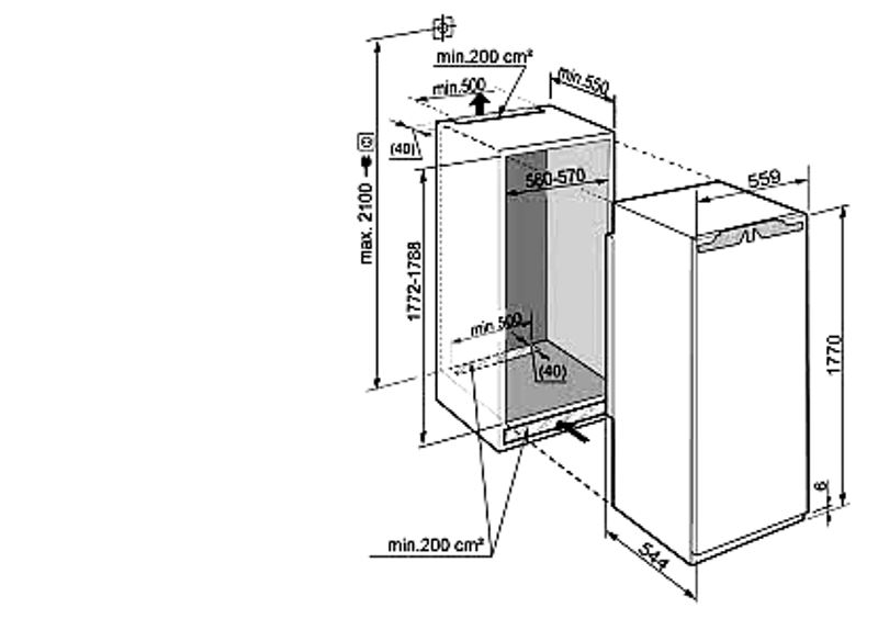 У вас є можливість придбати встраиваемий однокамерний холодильник Liebherr IKB 3514, який поєднує в собі стильний білий дизайн та компактні розміри. Цей холодильник має висоту 178.6 см, ширину 55.9 см і глибину 54.4 см, що робить його ідеальним для невеликих кухонь або вбудованих систем.