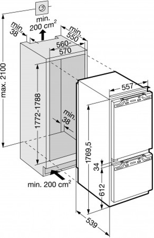 Представляємо вам встраиваемий двухкамерний холодильник Liebherr IKV 3214, який ідеально підійде для будь-якої кухні. З висотою 177 см, шириною 55.7 см і глибиною 54.5 см, цей холодильник має оптимальні розміри для зручного розміщення. Завдяки корисному об'єму в **279 л**, ви зможете з легкістю зберігати всі ваші продукти.