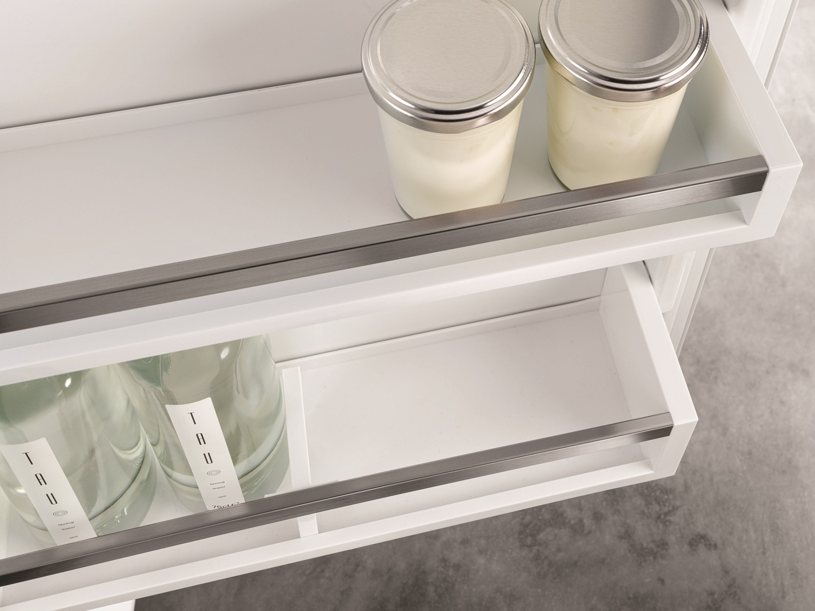 Для зручності використання передбачено сенсорне управління, а також захист від дітей. У холодильнику знаходиться світлодіодне освітлення та дві регульовані по висоті полки, що дозволяє оптимально використовувати простір. Азотна фільтрація, що включає вуглецевий фільтр, забезпечує чистоту повітря.