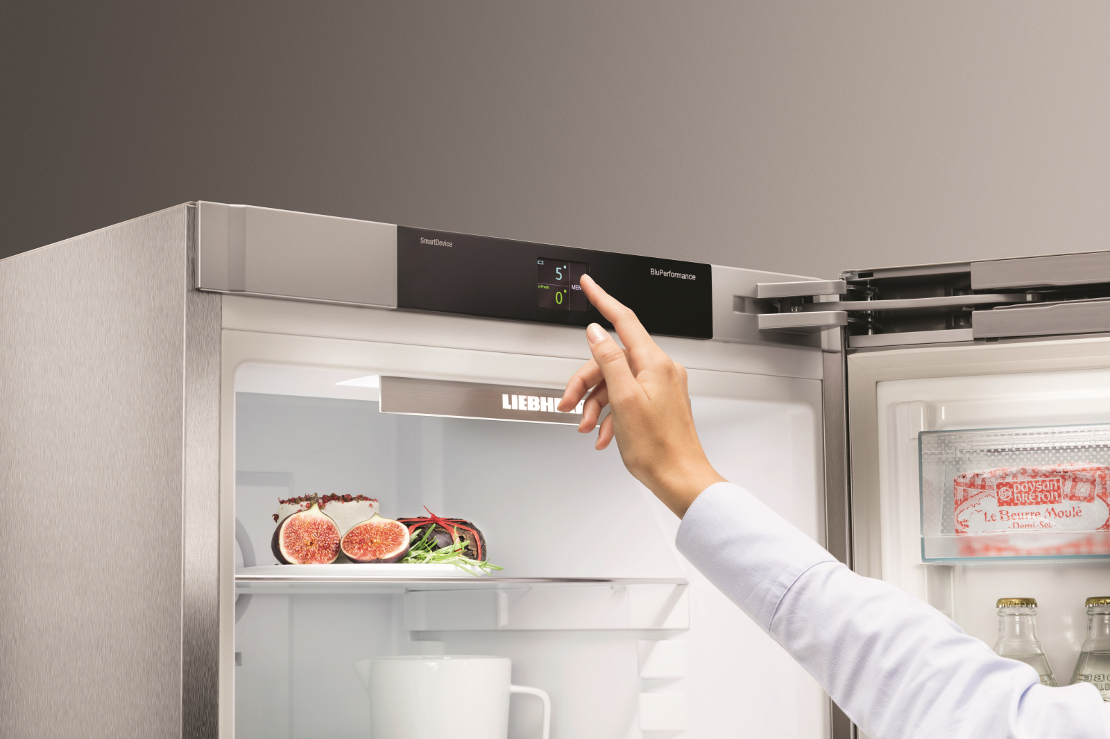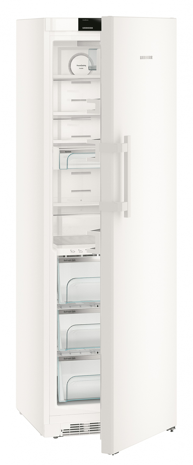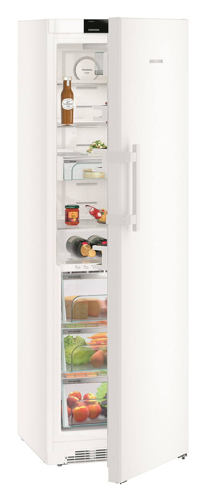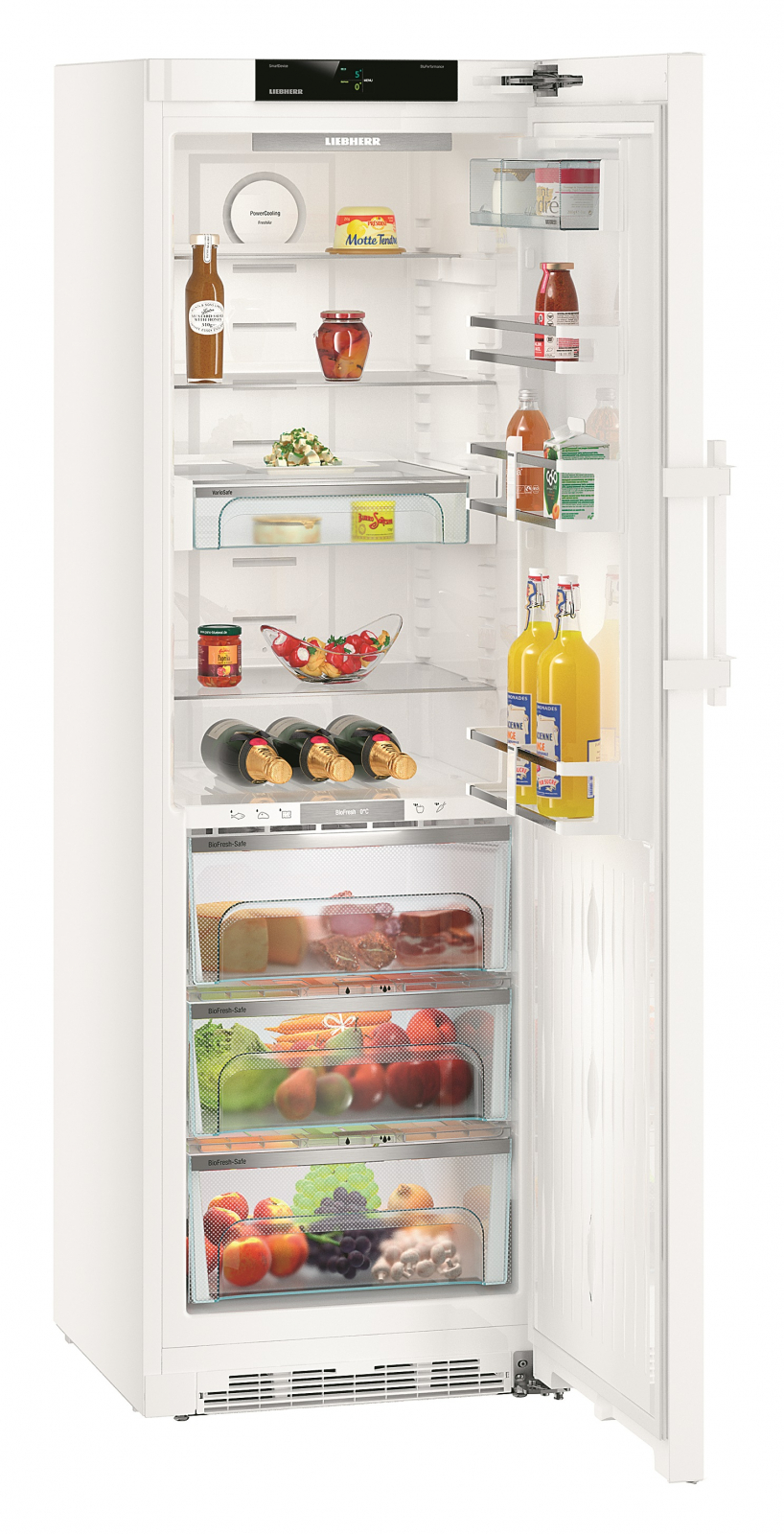 Система **SuperCool** дозволяє швидко охолоджувати нові продукти, а **VarioSafe** і **SoftSystem** забезпечують комфорт у користуванні, відчиняючи двері без зайвих зусиль. Холодильник має **сенсорний дисплей** для зручного керування, а функція **SmartDevice** дозволяє підключати пристрій до вашого смартфону.