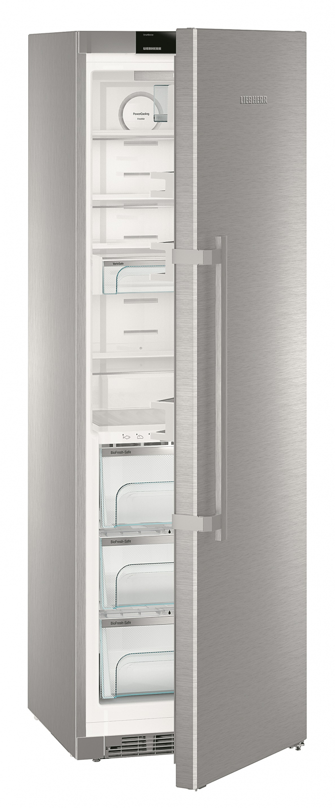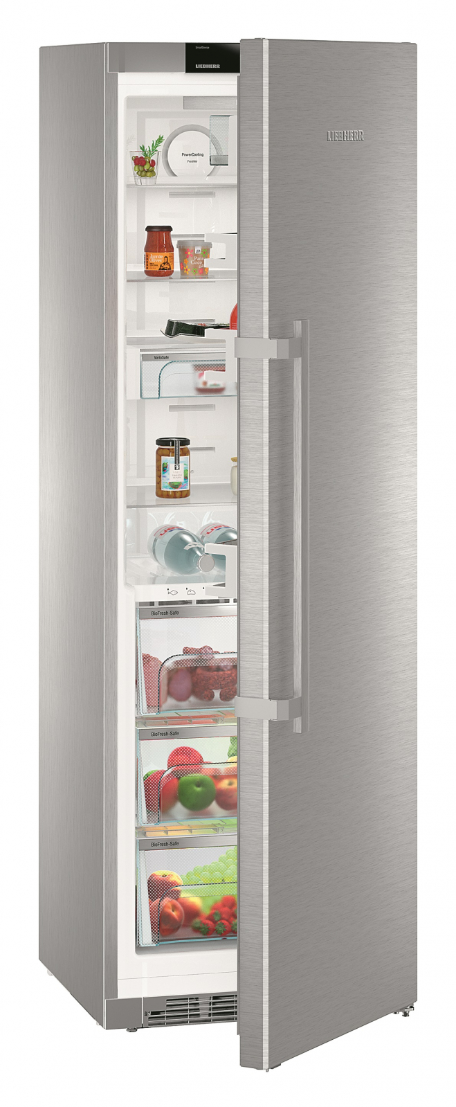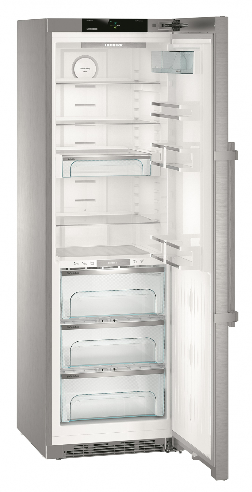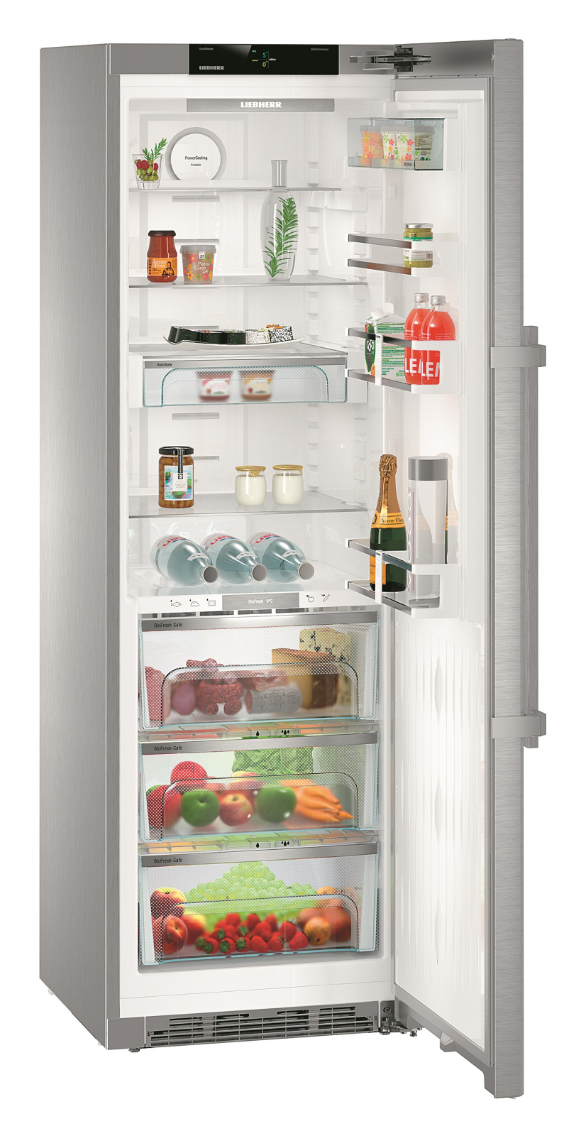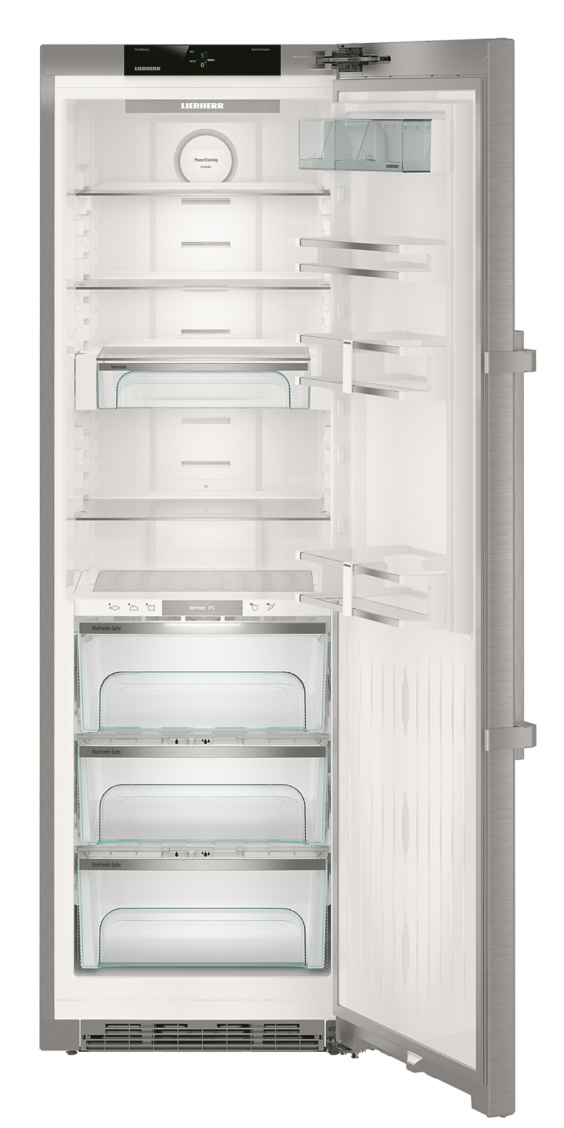 Матеріал дверей — **нержавіюча сталь з покриттям SmartSteel**, що робить його не лише стійким до пошкоджень, але й легким у догляді. У холодильнику також присутні **регульовані полки**, що дозволяють оптимально використовувати простір. З **два контейнери VarioBox** і **три контейнери BioFresh** ви зможете зберігати продукти організовано та зручно.