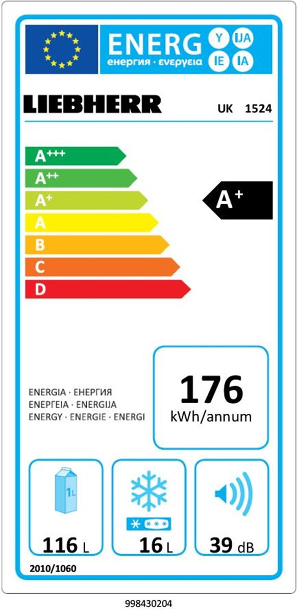 Модель UK 1524 має клас енергоспоживання A+, що гарантує економічне використання електроенергії. Споживана потужність становить 193.2 Вт, а річне енергоспоживання складає 176 кВт/год. Загальний об’єм холодильника складає 141 л, у тому числі 116 л для холодильної камери та 16 л для морозильної.