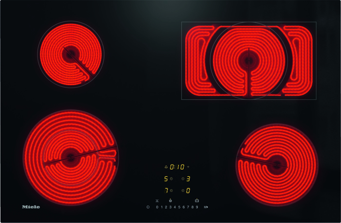 Miele KM 6542 FL - це вбудована електрична варильна поверхня з чотирма конфорками HiLight. Керування здійснюється за допомогою ComfortSelect з жовтою підсвіткою та вибором потужності за цифровою шкалою. Поверхня варильної панелі виготовлена зі склокераміки.