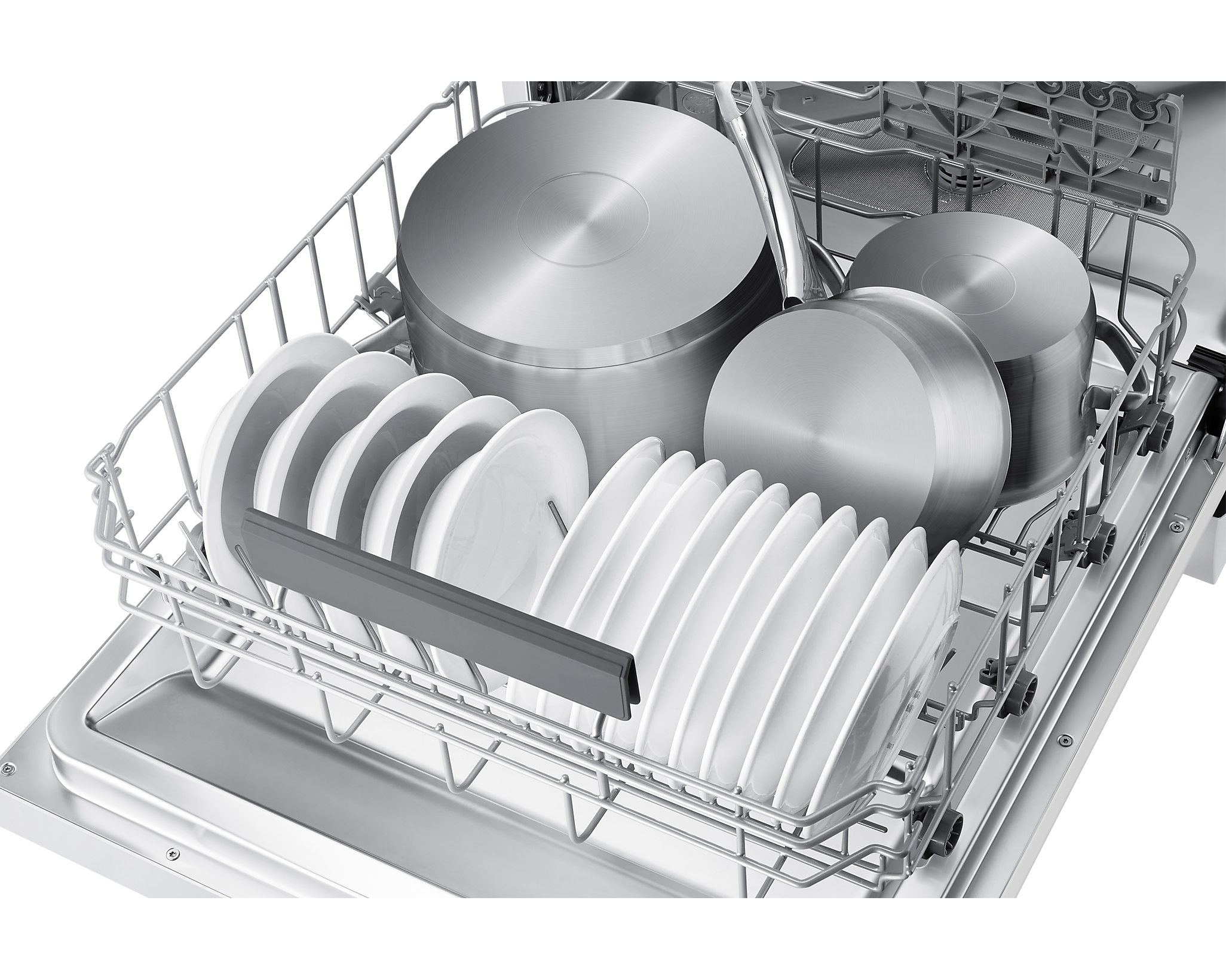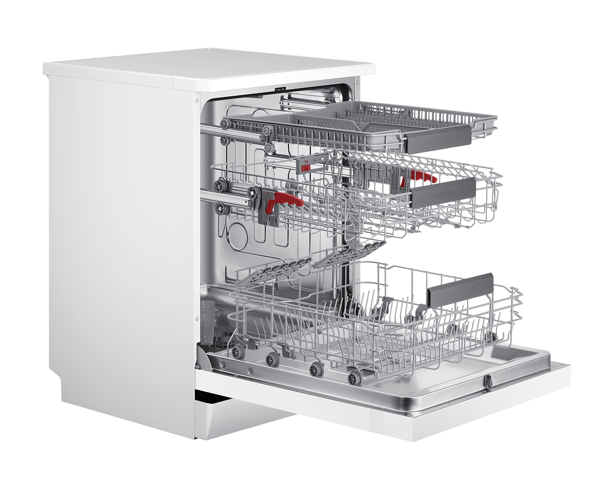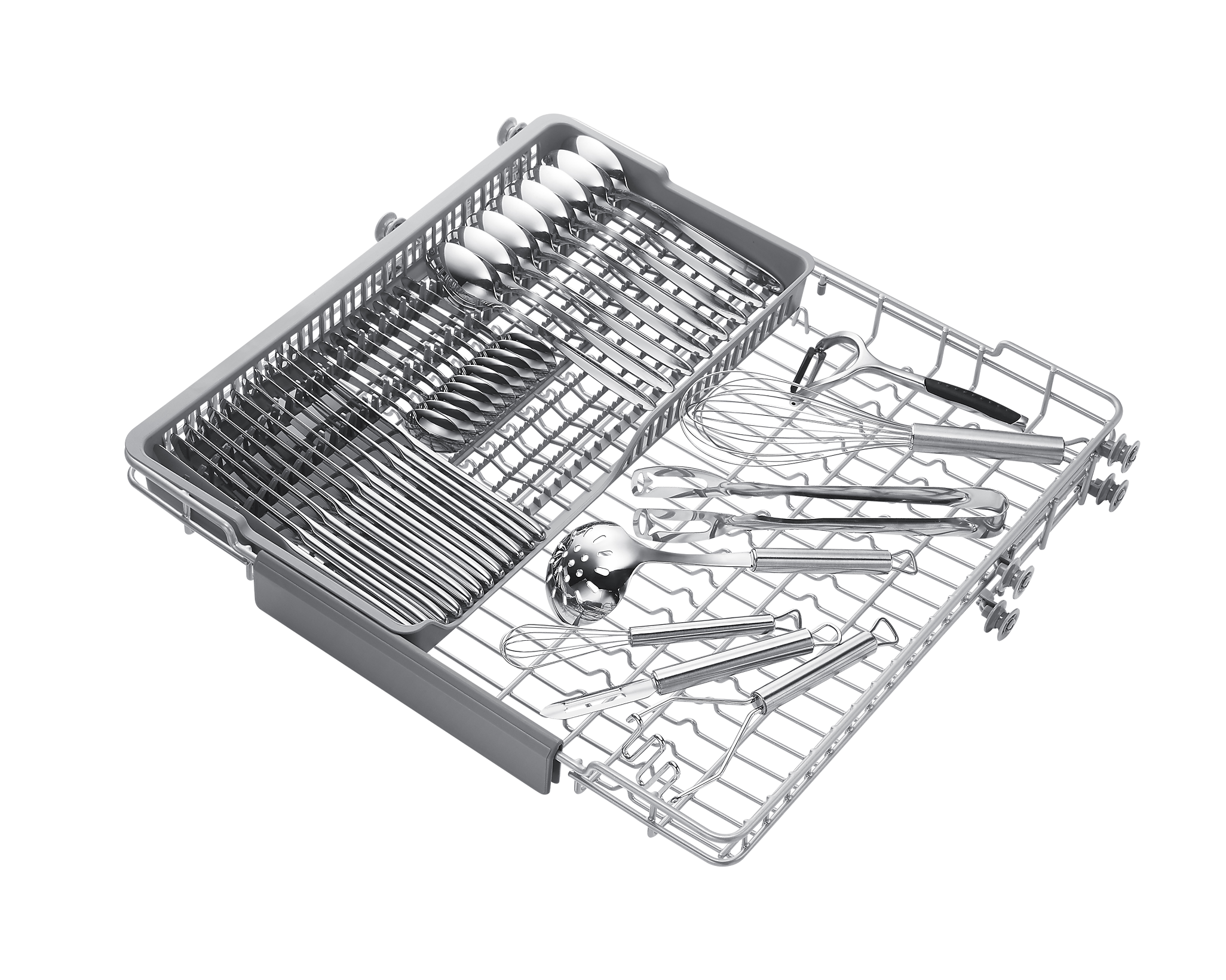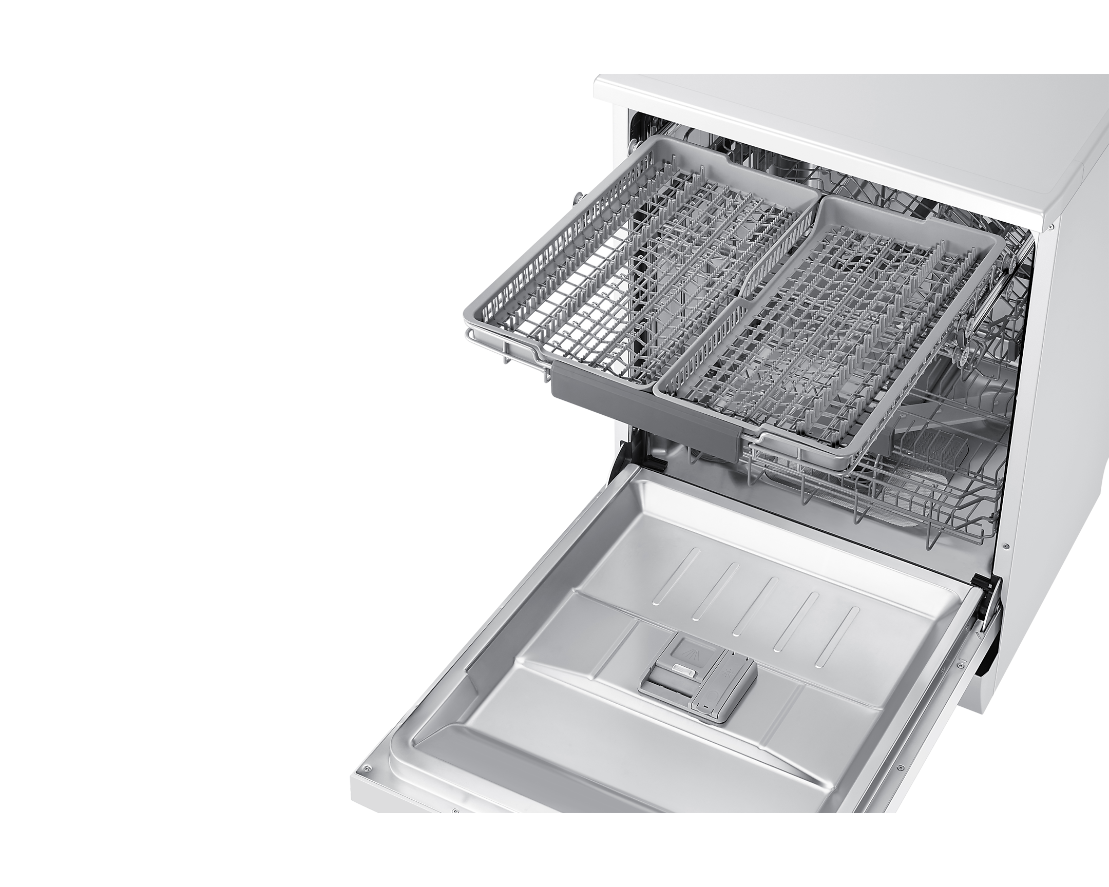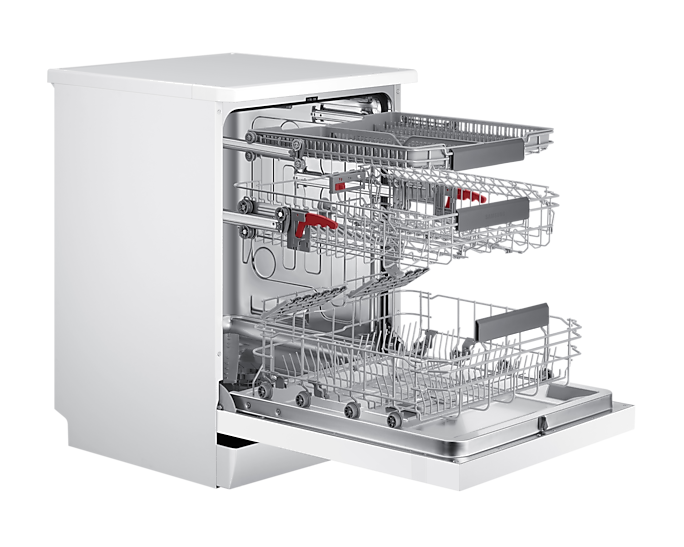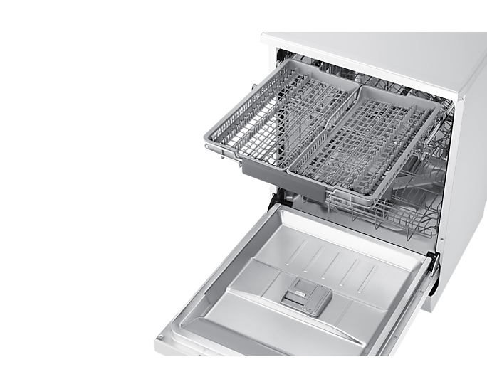 Однією з ключових функцій є Auto Open, що автоматично відкриває дверцята після завершення циклу, прискорюючи сушіння та покращуючи результати миття. Зручність у завантаженні забезпечує Flex Load з регульованим кутом зубців та Soft Railing для легкого висування кошиків. Третій розкладний металевий кошик додає простору для столових приборів, що підвищує ефективність використання.
