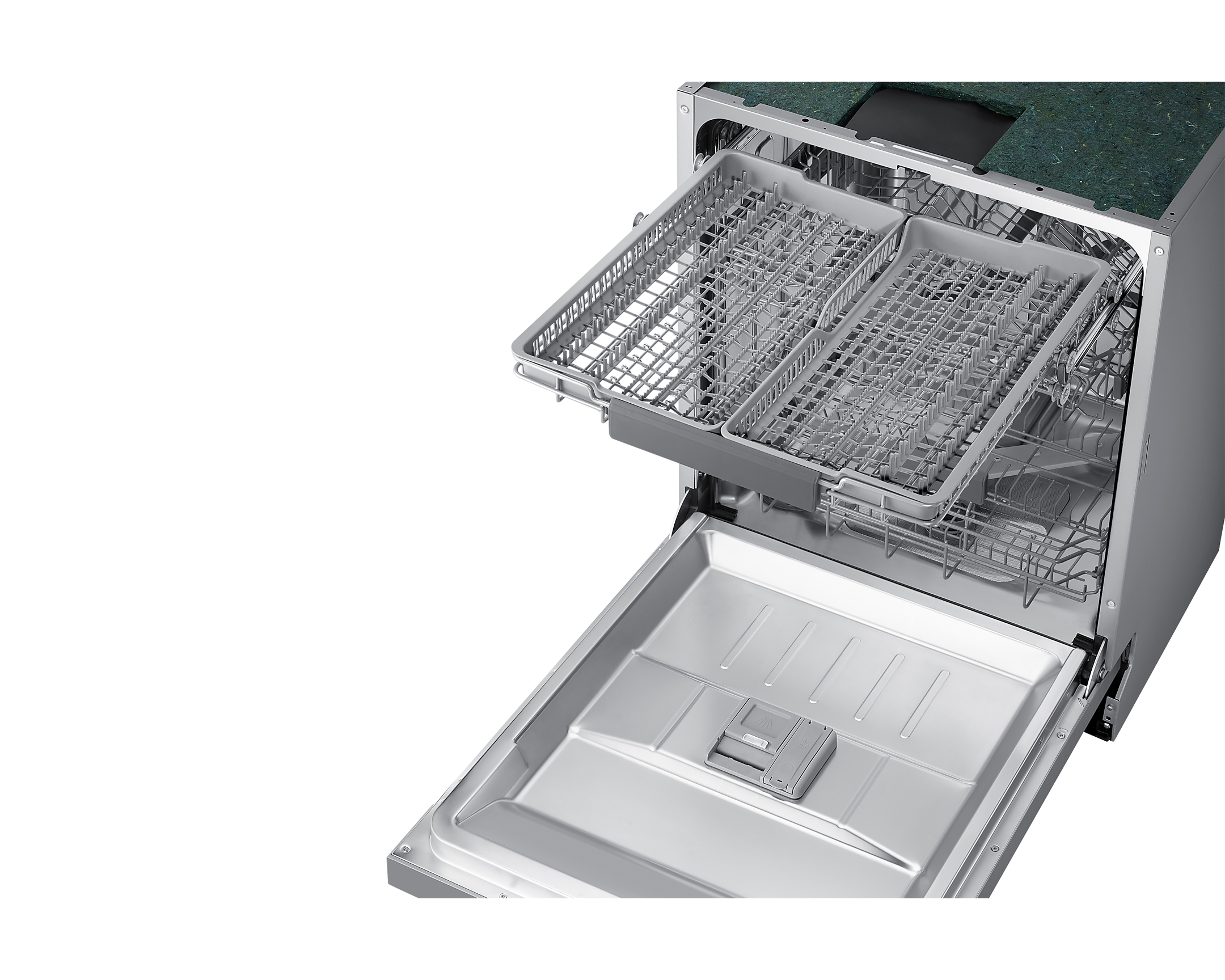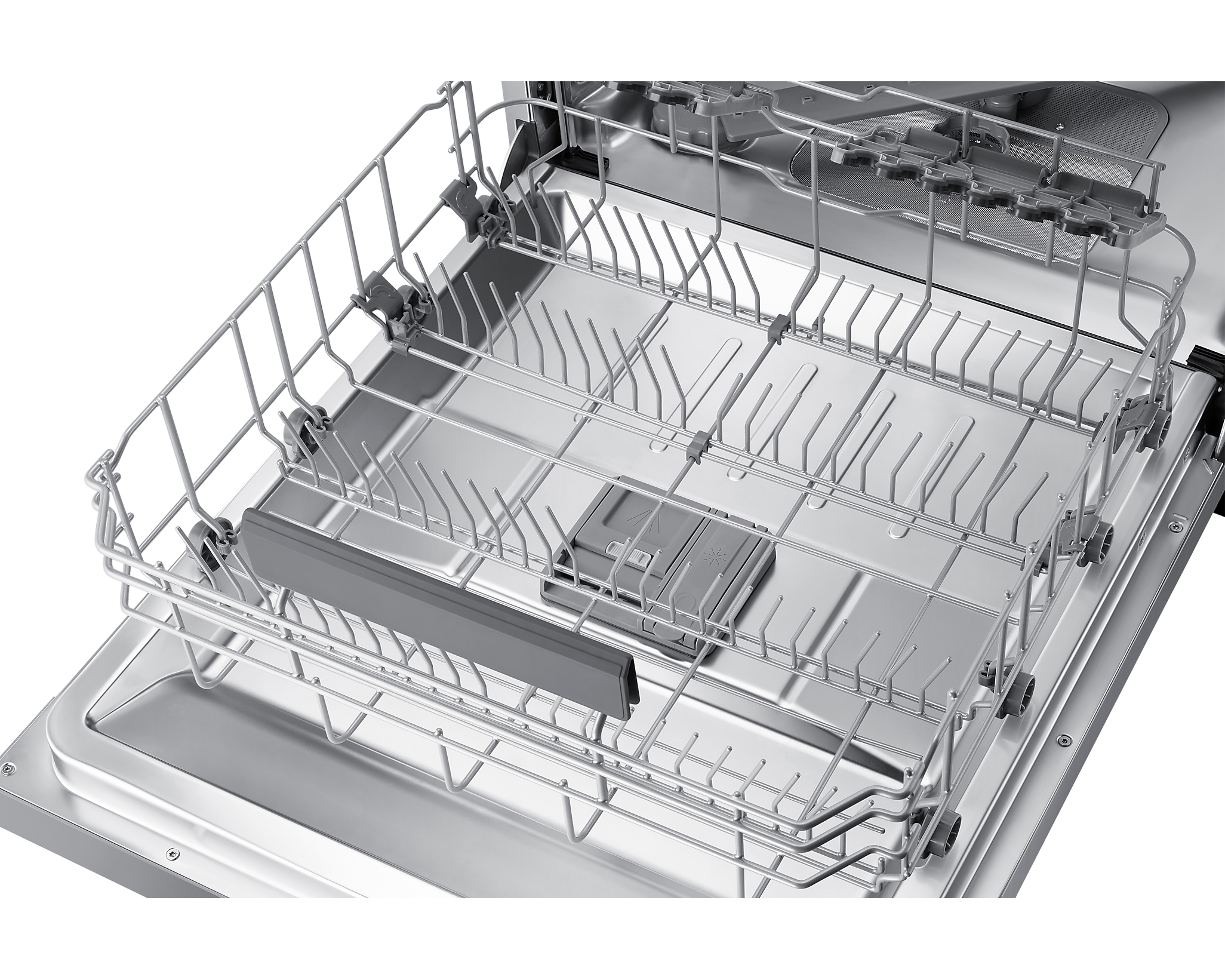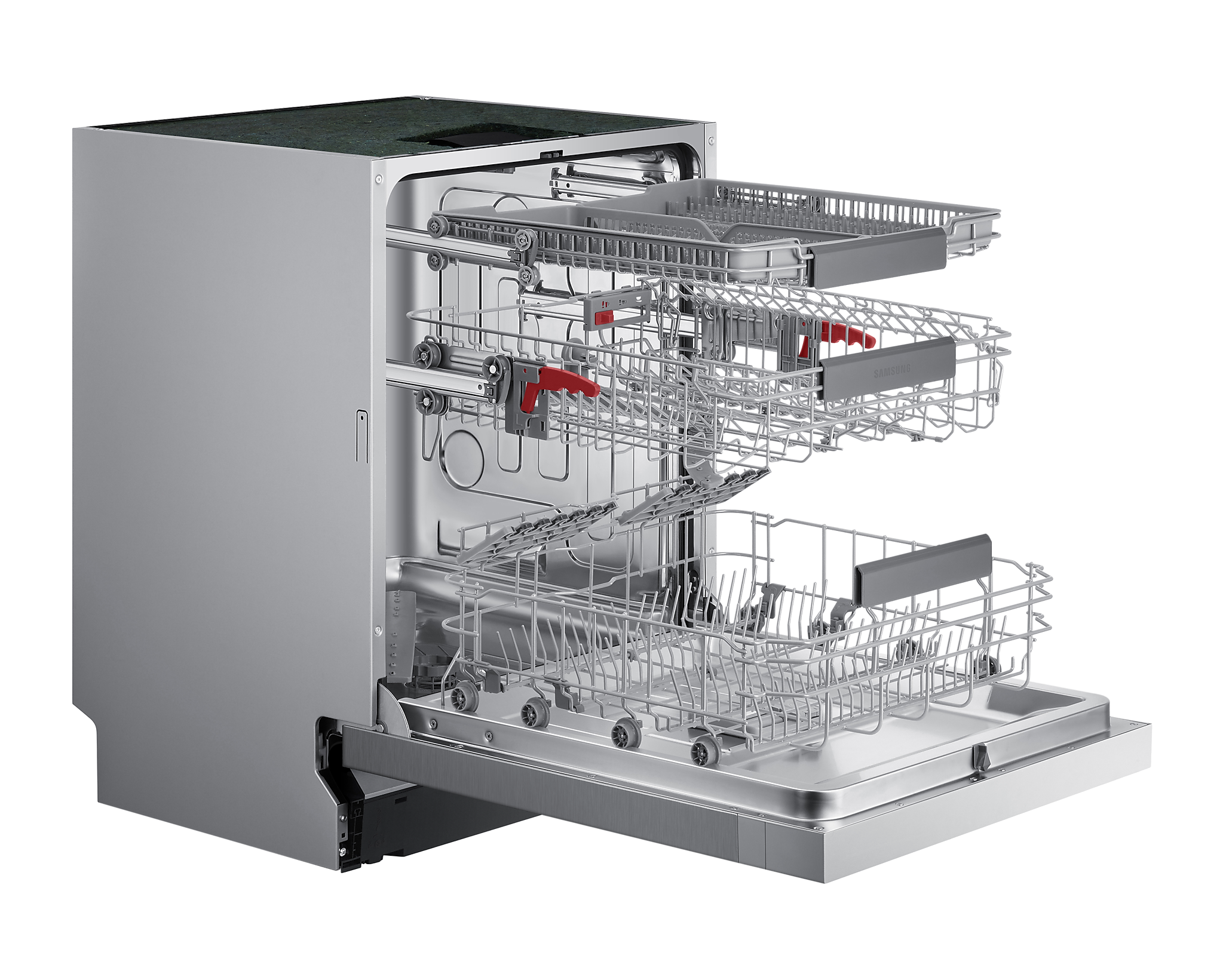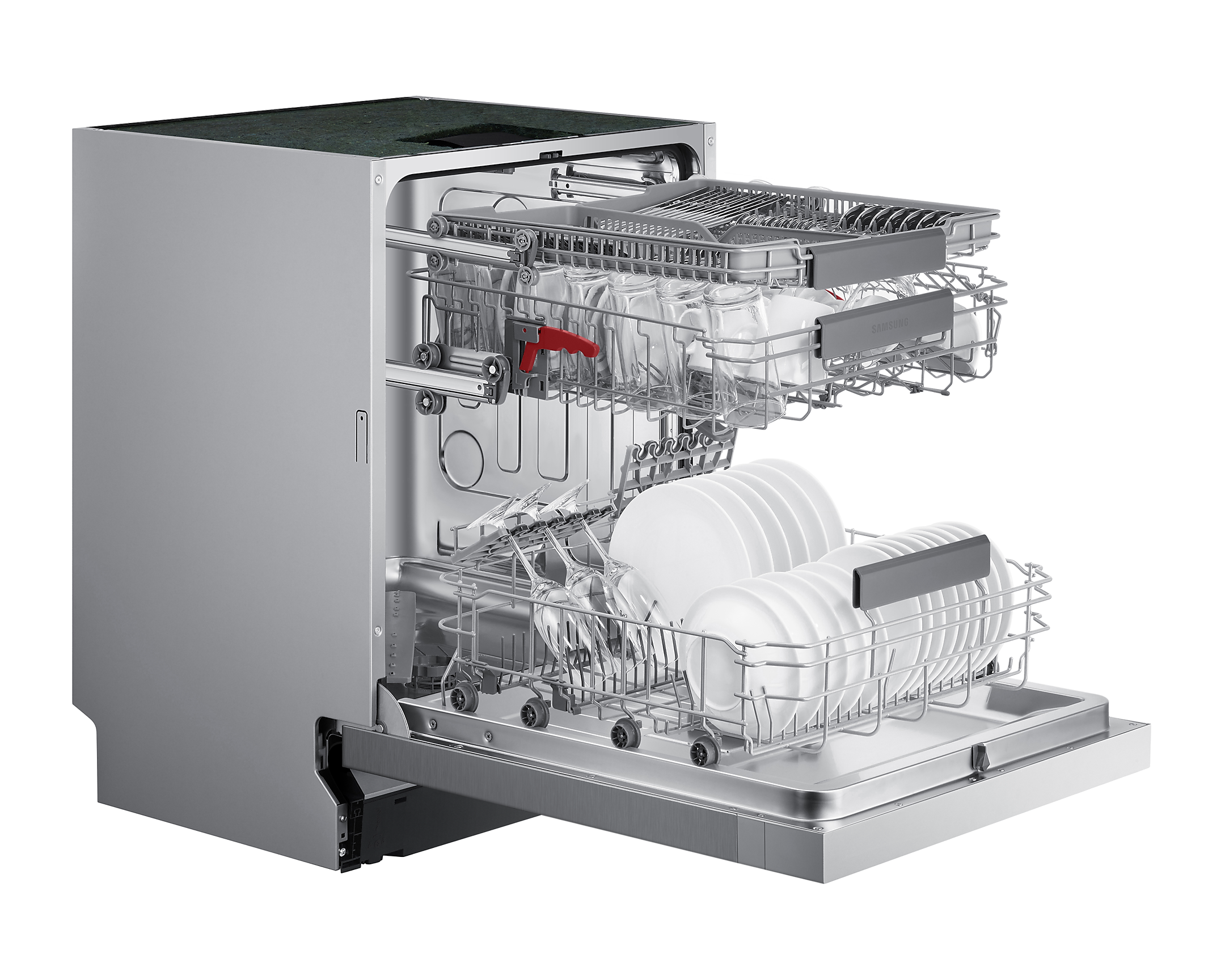 Ця модель оснащена інноваційною технологією Автоматичного регулювання, що дозволяє з легкістю налаштувати верхній кошик на потрібну висоту, забезпечуючи місце для великого посуду. Також, завдяки М'якому веденню, кошики легко висуваються, навіть коли вони заповнені важким посудом.