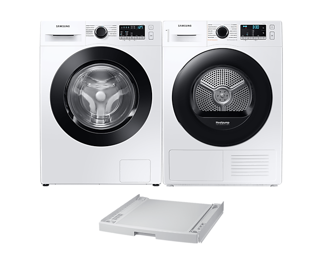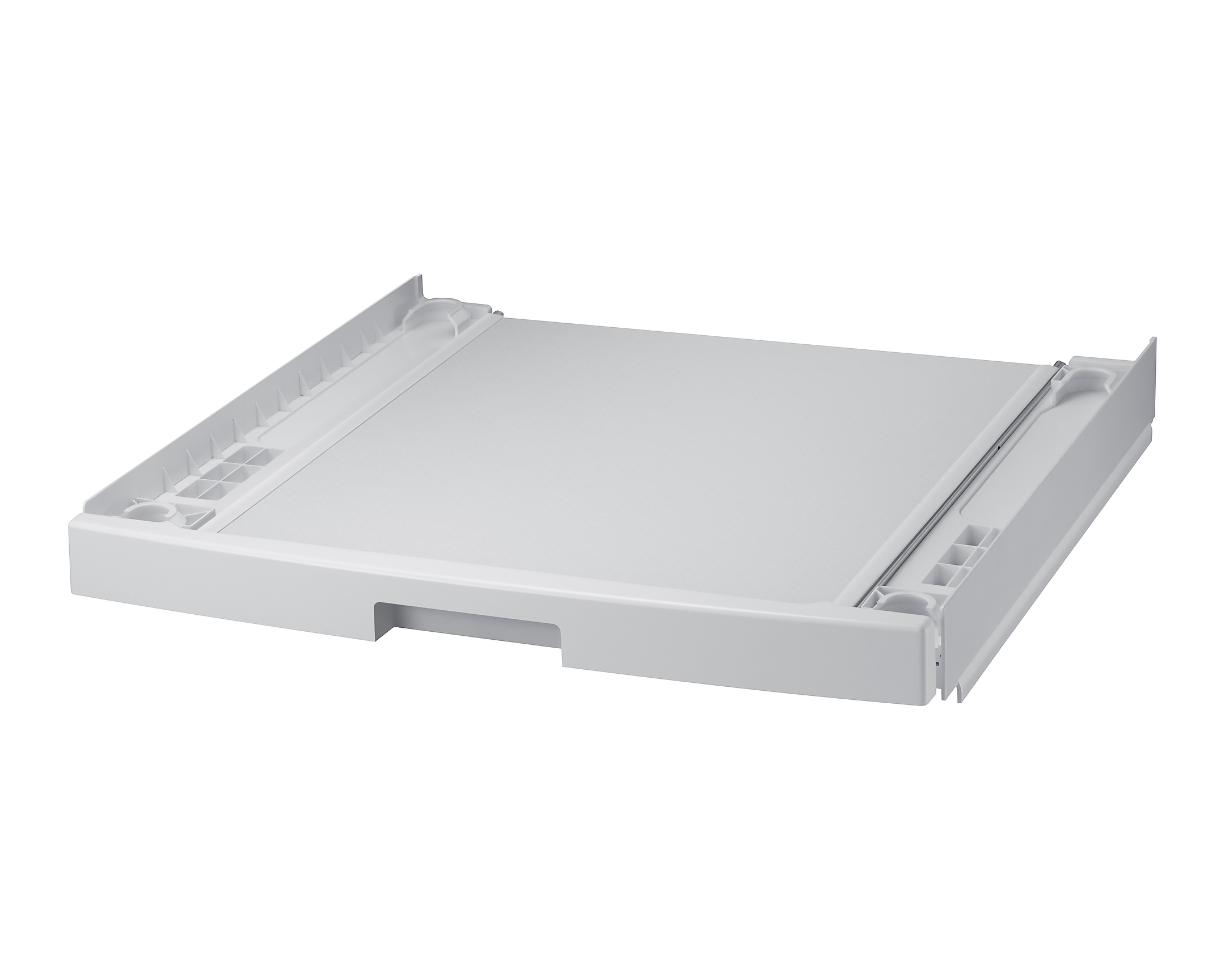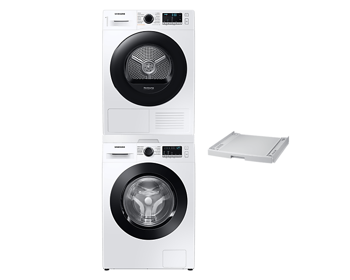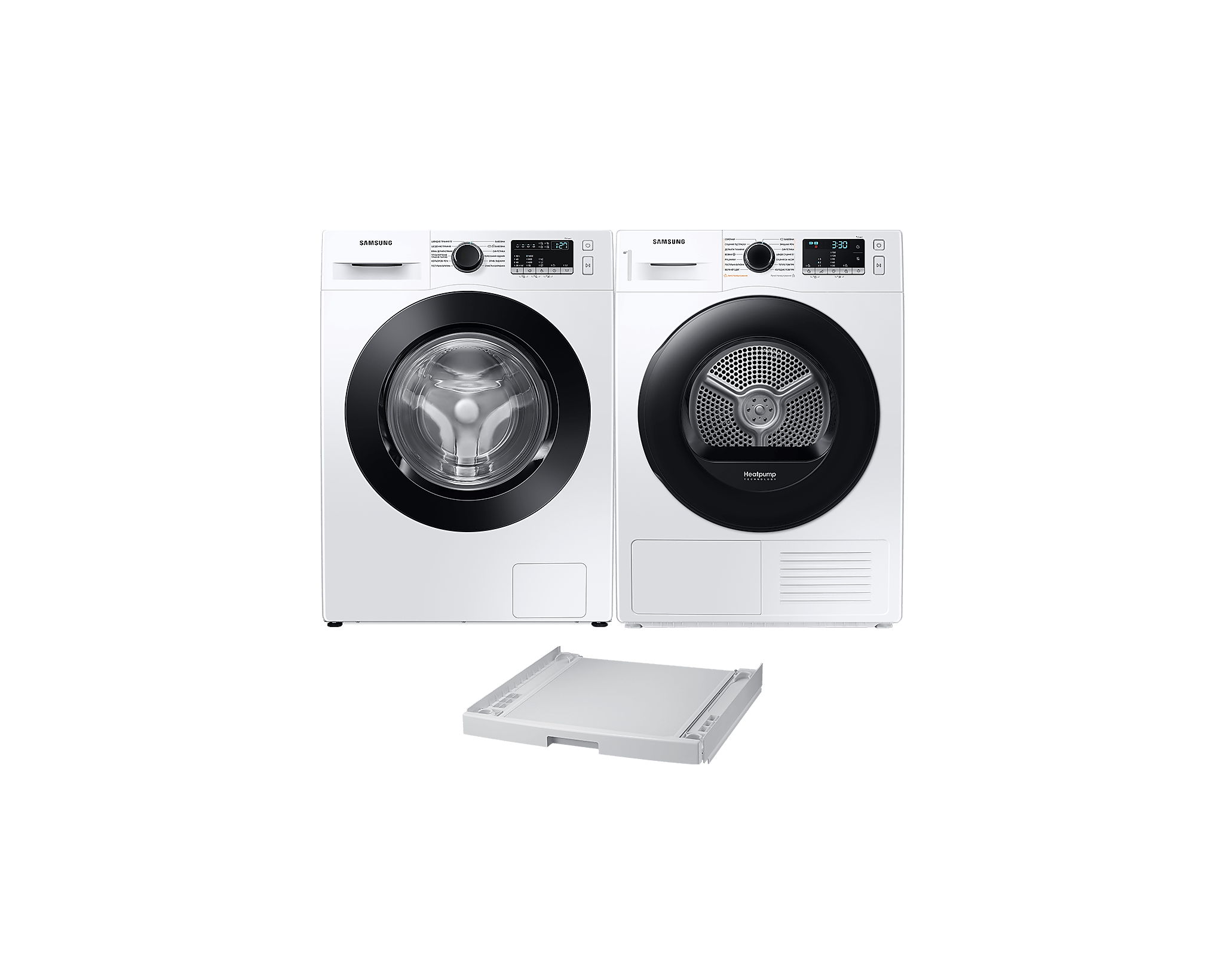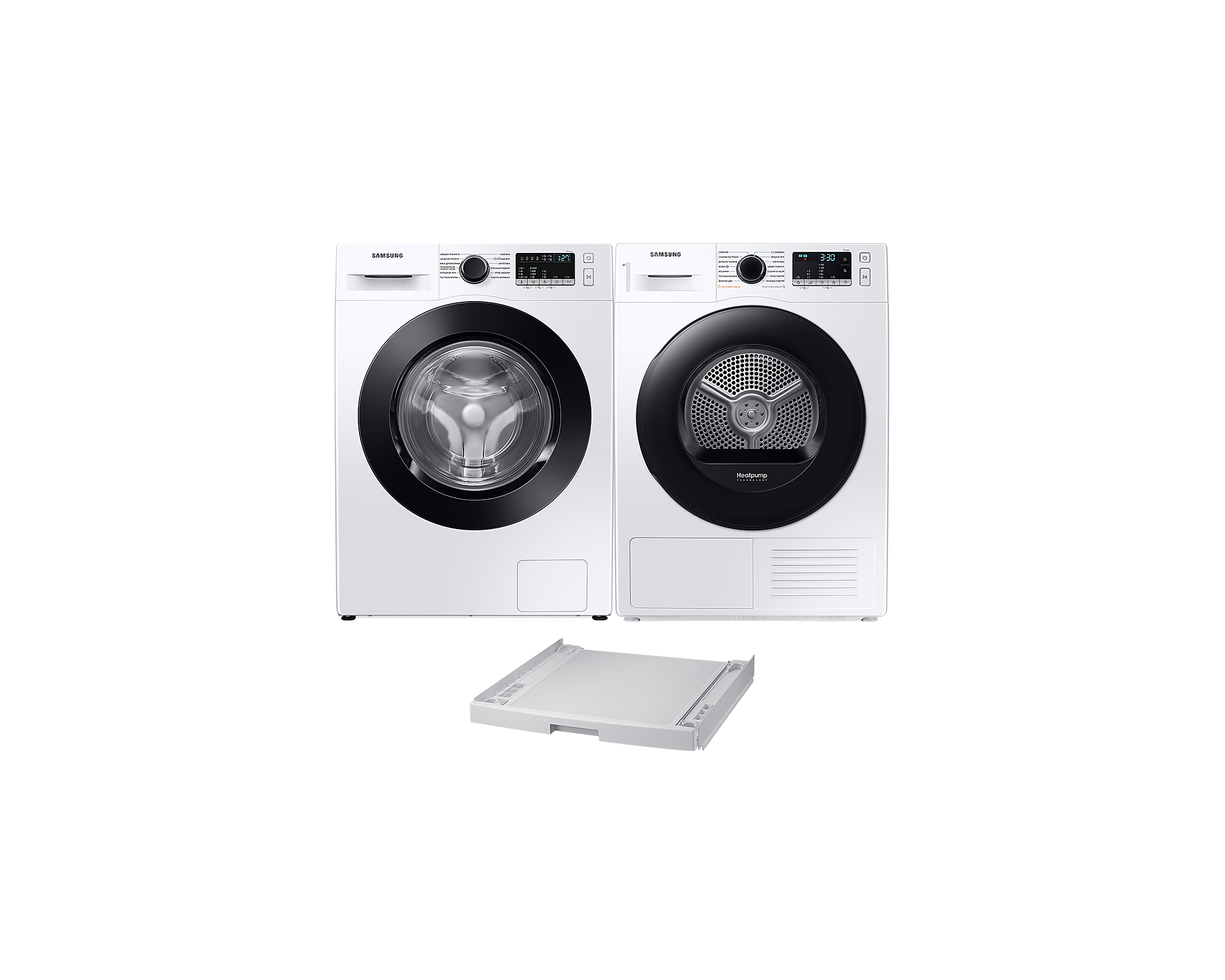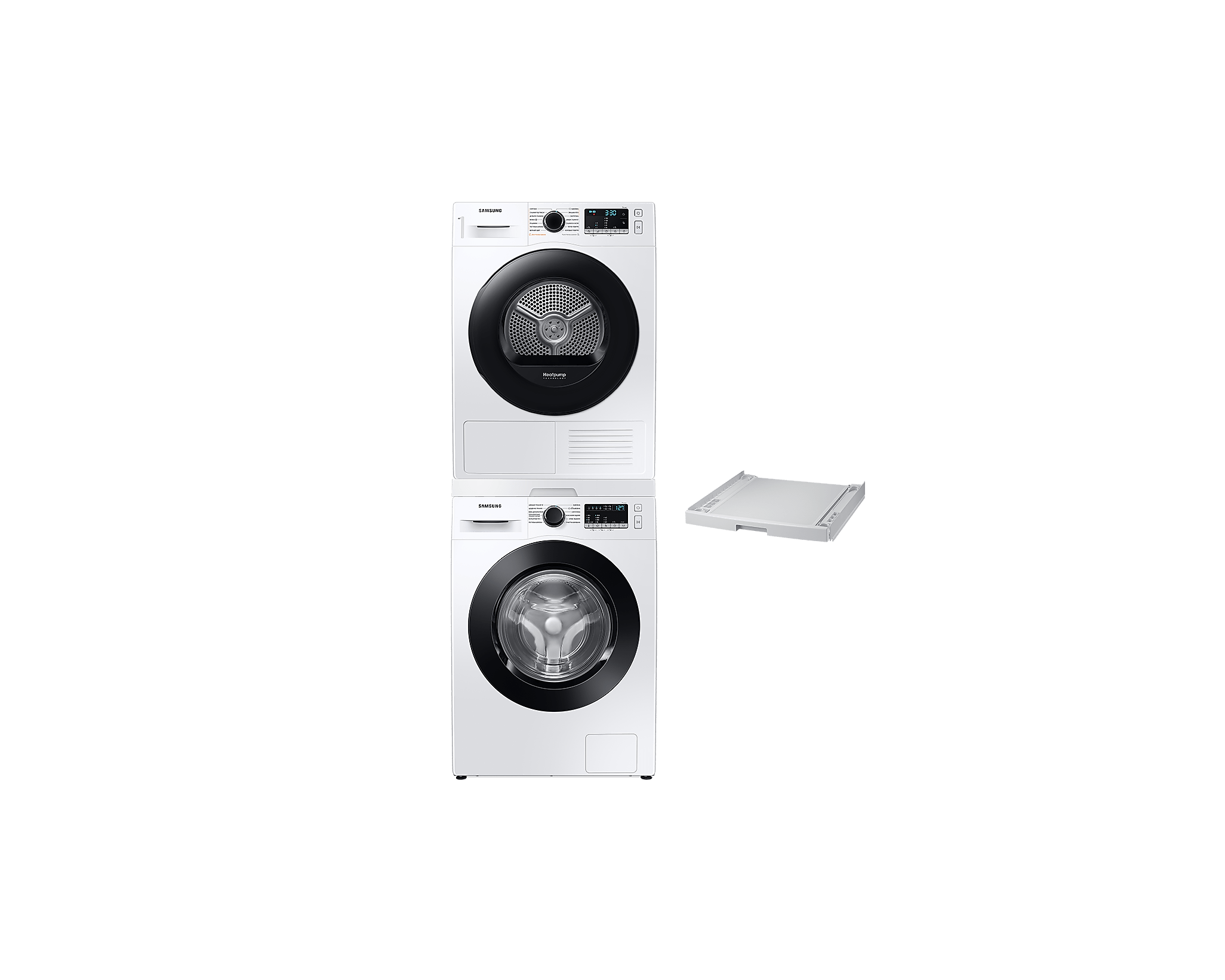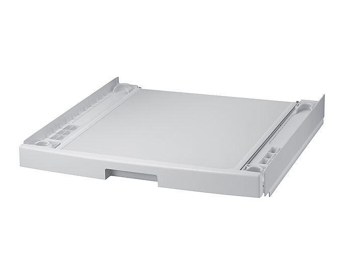 Комплектація включає з'єднувальну планку SKK-DD, яка дозволяє вертикально ставити пральну та сушильну машини, забезпечуючи більше простору в вашому будинку. Ще однією корисною деталлю є висувна полиця, яка полегшує сортування та розвантаження білизни. Також важливо зазначити, що цей комплект сумісний з різними моделями пральних машин Samsung.