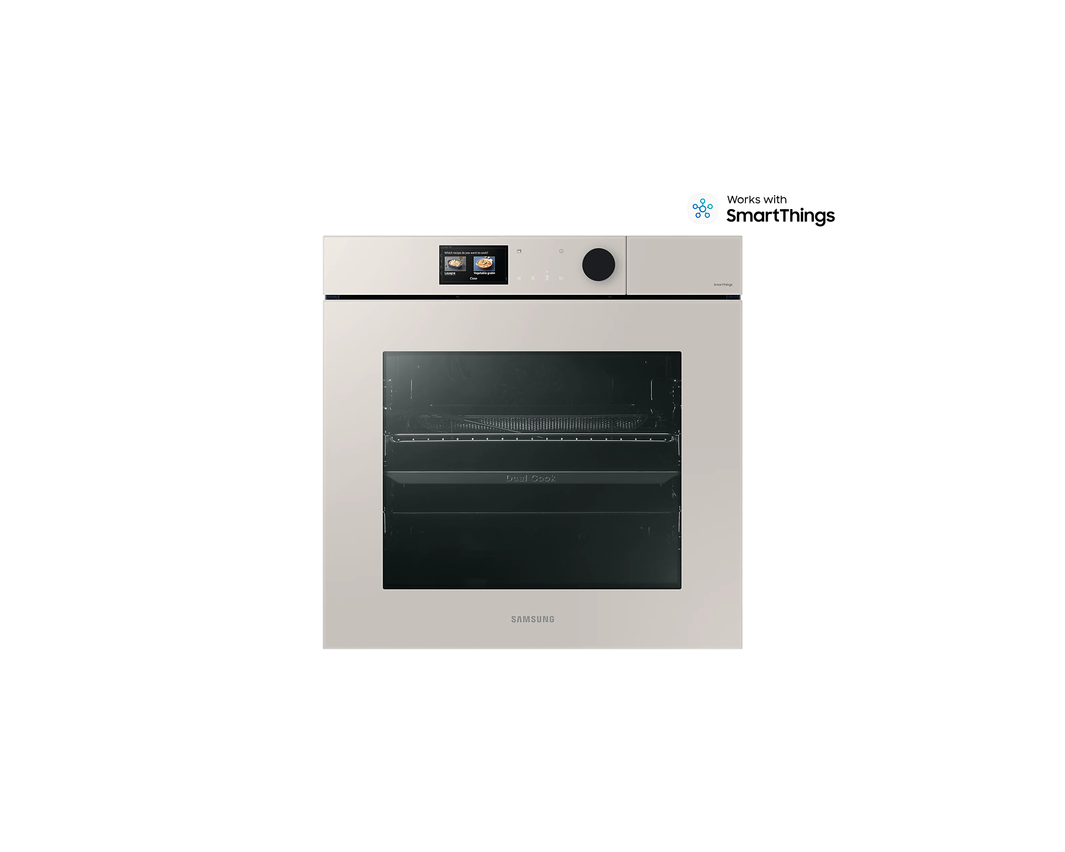 Ця духовка також обладнана вбудованою камерою, що дозволяє стежити за процесом приготування через програму SmartThings на мобільному пристрої. Функція Air Fry допомагає приготувати смачні страви з меншим використанням олії, роблячи їх кориснішими. Не забувайте про піролітичне очищення, яке позбавляє вас від необхідності вручну прибирати внутрішні поверхні духовки.