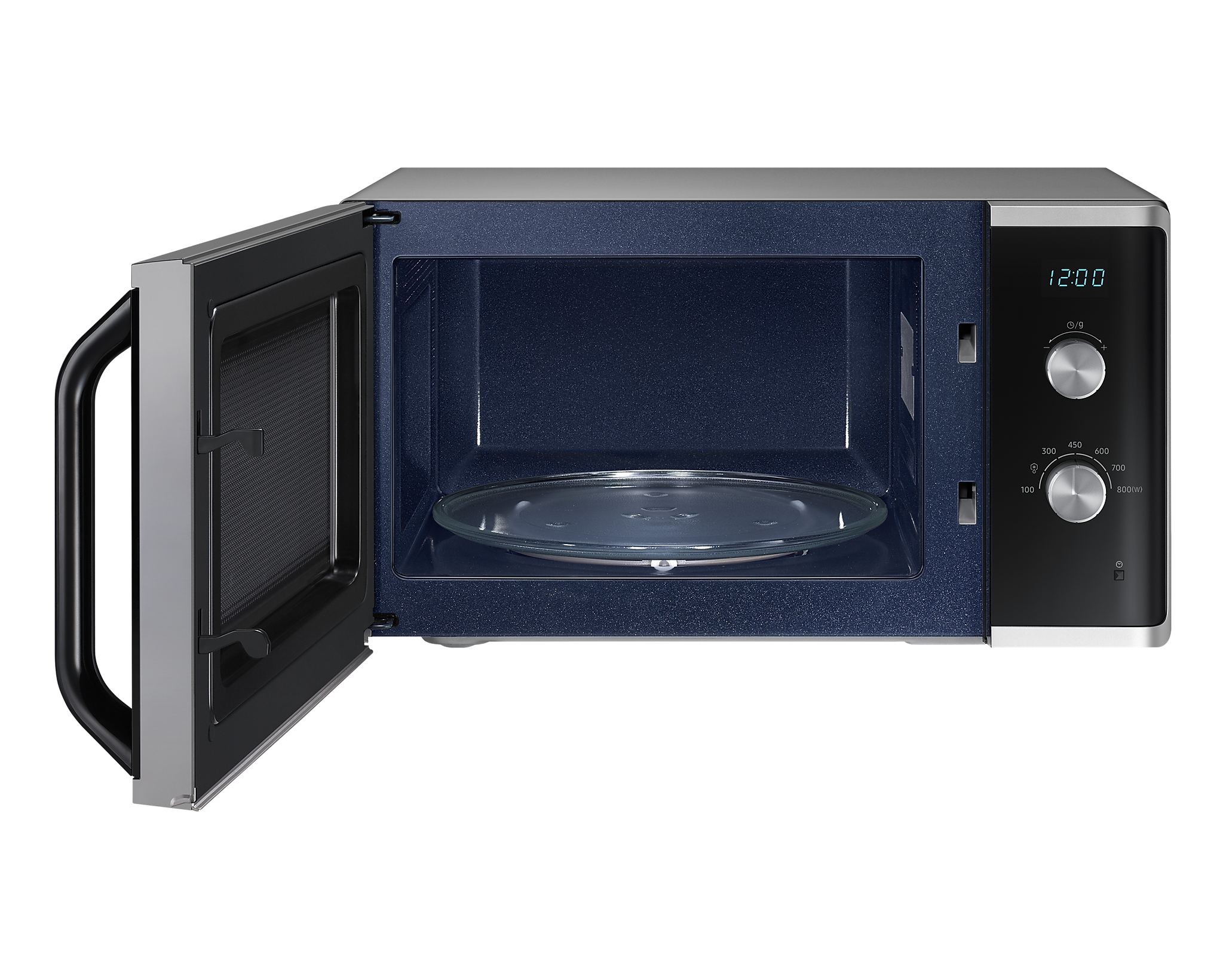 Подвійний перемикач дозволяє легко налаштовувати час та потужність приготування, роблячи процес приготування простим і швидким. А стильний сріблястий колір дверцят та корпусу надає елегантності у вашій кухні. Внутрішній об’єм печі складає 23 літри, що дозволяє готувати достатні порції їжі для сім'ї.