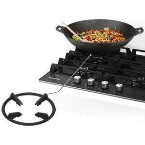 Крім того, варильна поверхня має зручні чавунні решітки, які дозволяють легко переміщати посуд. У комплекті ви знайдете спеціальну підставку для сковороди "Вок". Використовуйте цю панель без побоювань, адже її знімні компоненти можна мити у посудомийній машині, що значно спростить процес прибирання.