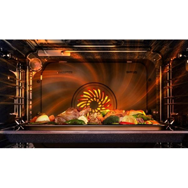 Духовка виготовлена з **нержавіючої сталі**, що додає їй елегантного вигляду та легкого догляду. Її розміри становлять **59,5 х 59,5 х 57 см**, що дозволяє зручно вбудувати її у будь-яку кухонну меблі.