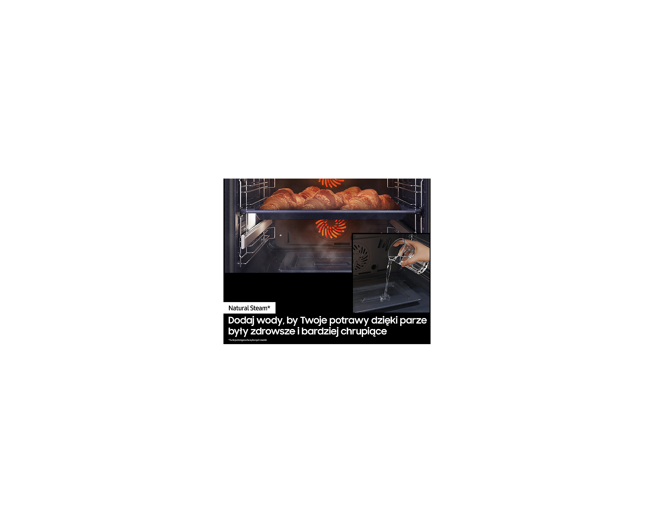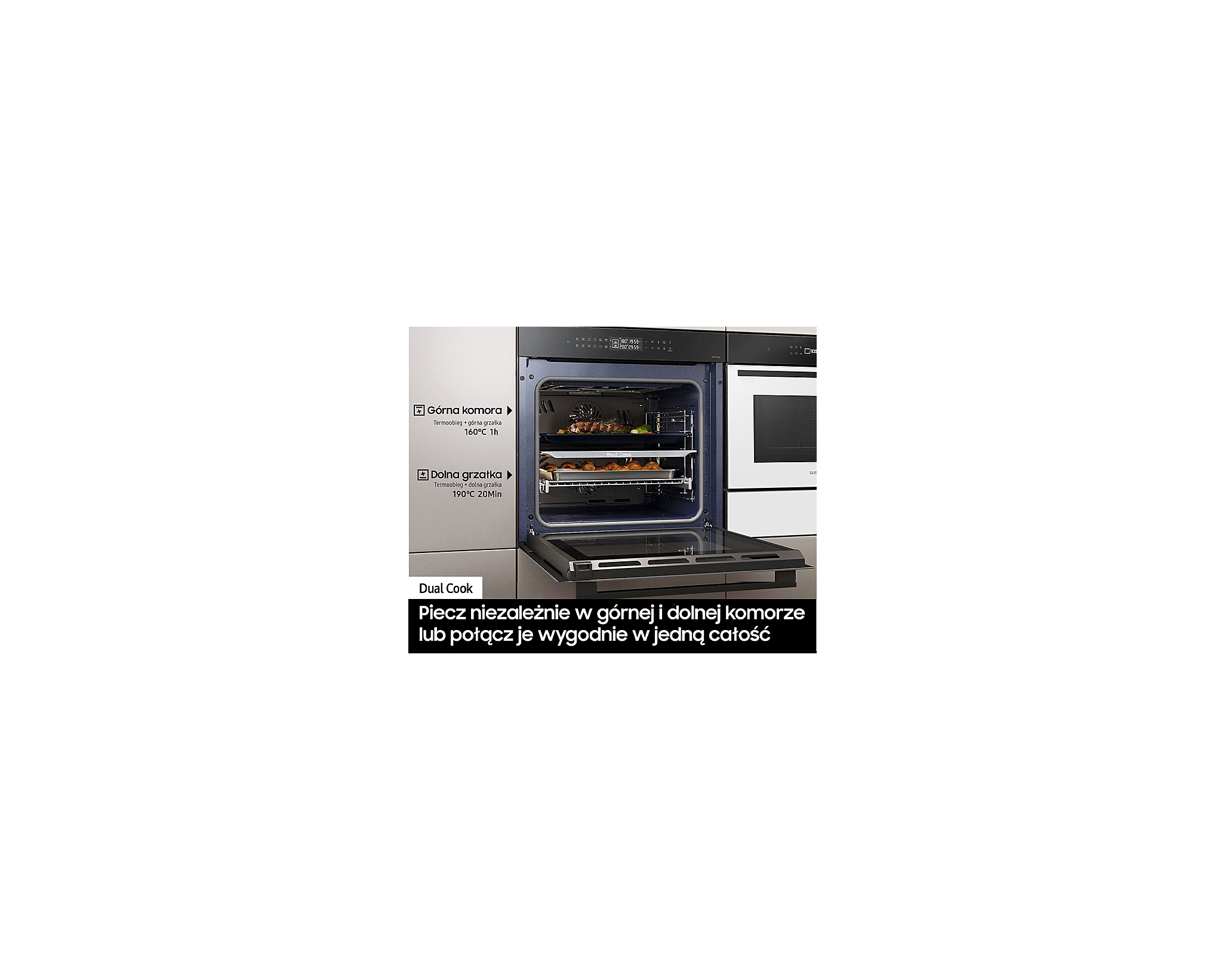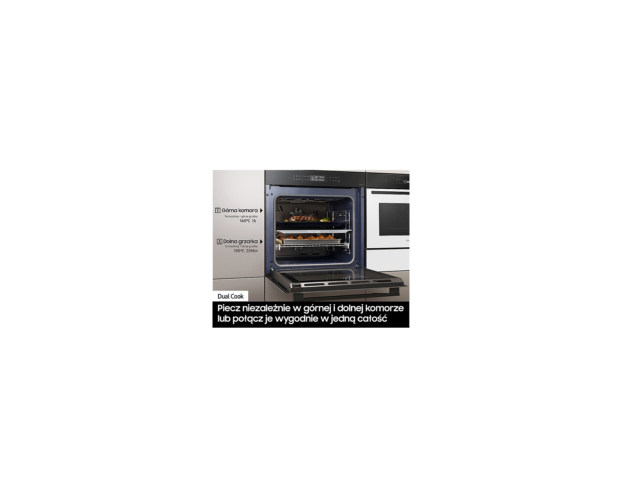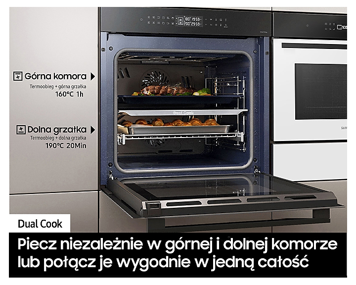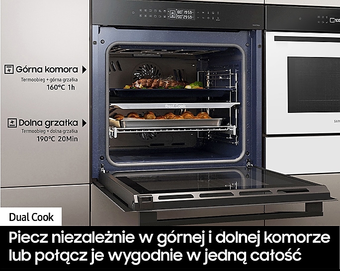 Головною особливістю цього приладу є Dual Cook, який дозволяє розділити простір духовки на дві окремі зони, що дає змогу готувати два різних блюда одночасно без змішування запахів. Використовуючи Natural Steam, ви зможете додати вашим страва вологість та соковитість, завдяки паровій технології приготування.