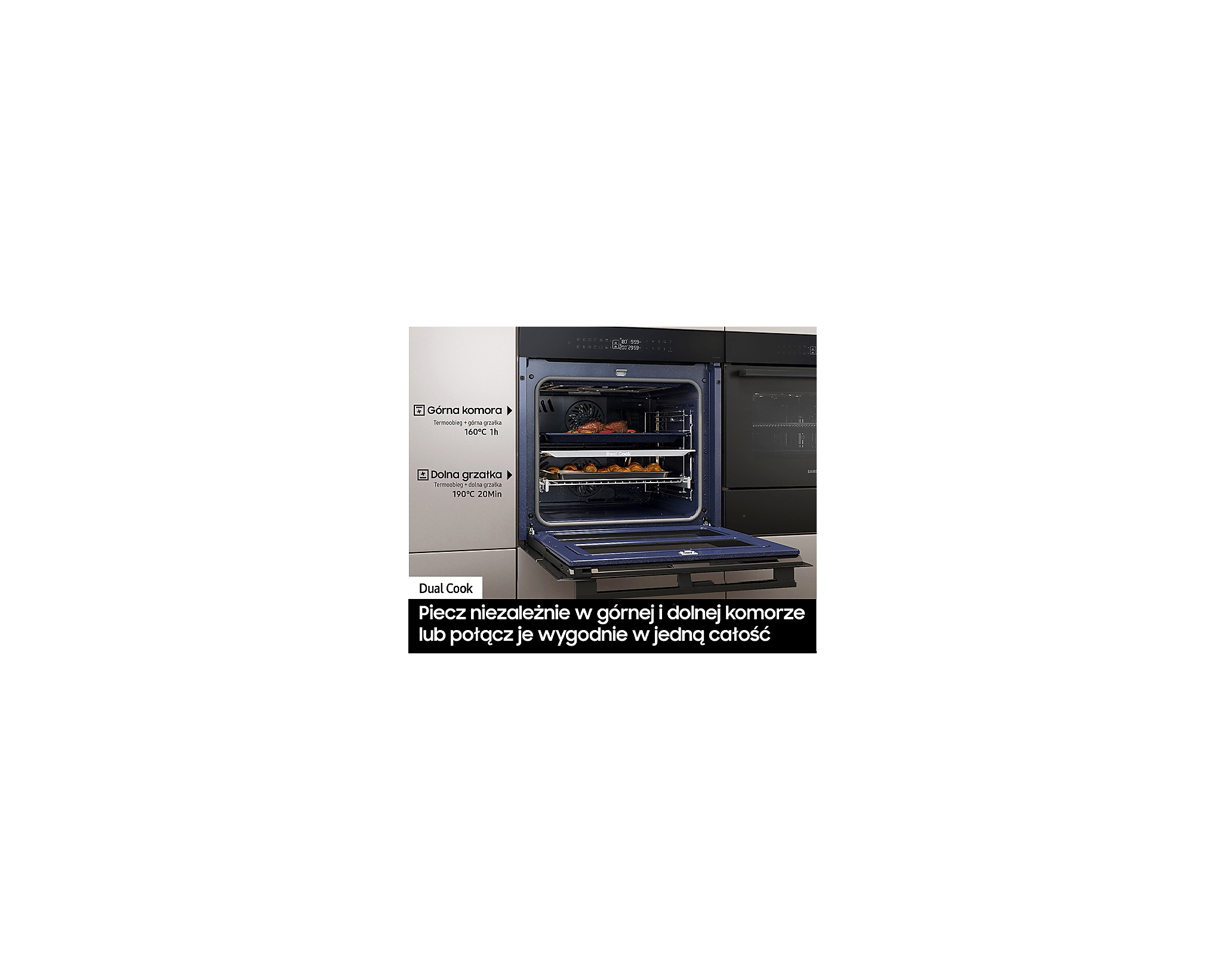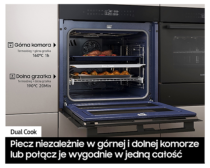 Цей духовой шафа обладнує унікальною технологією Dual Cook Flex, завдяки якій ви можете готувати кілька страв одночасно з різними налаштуваннями температури. Ваша кулінарія стане більш гнучкою, адже ви можете використовувати лише верхню частину або обидві зони разом для приготування великих страв, як індик чи запіканка.