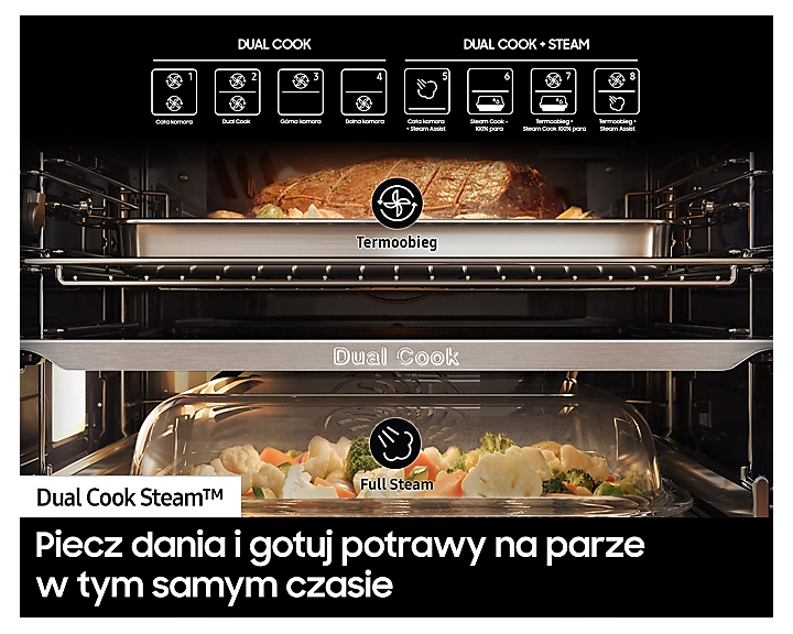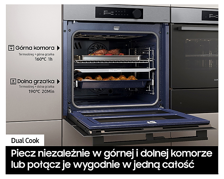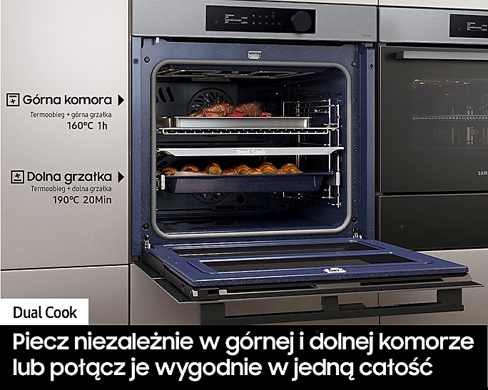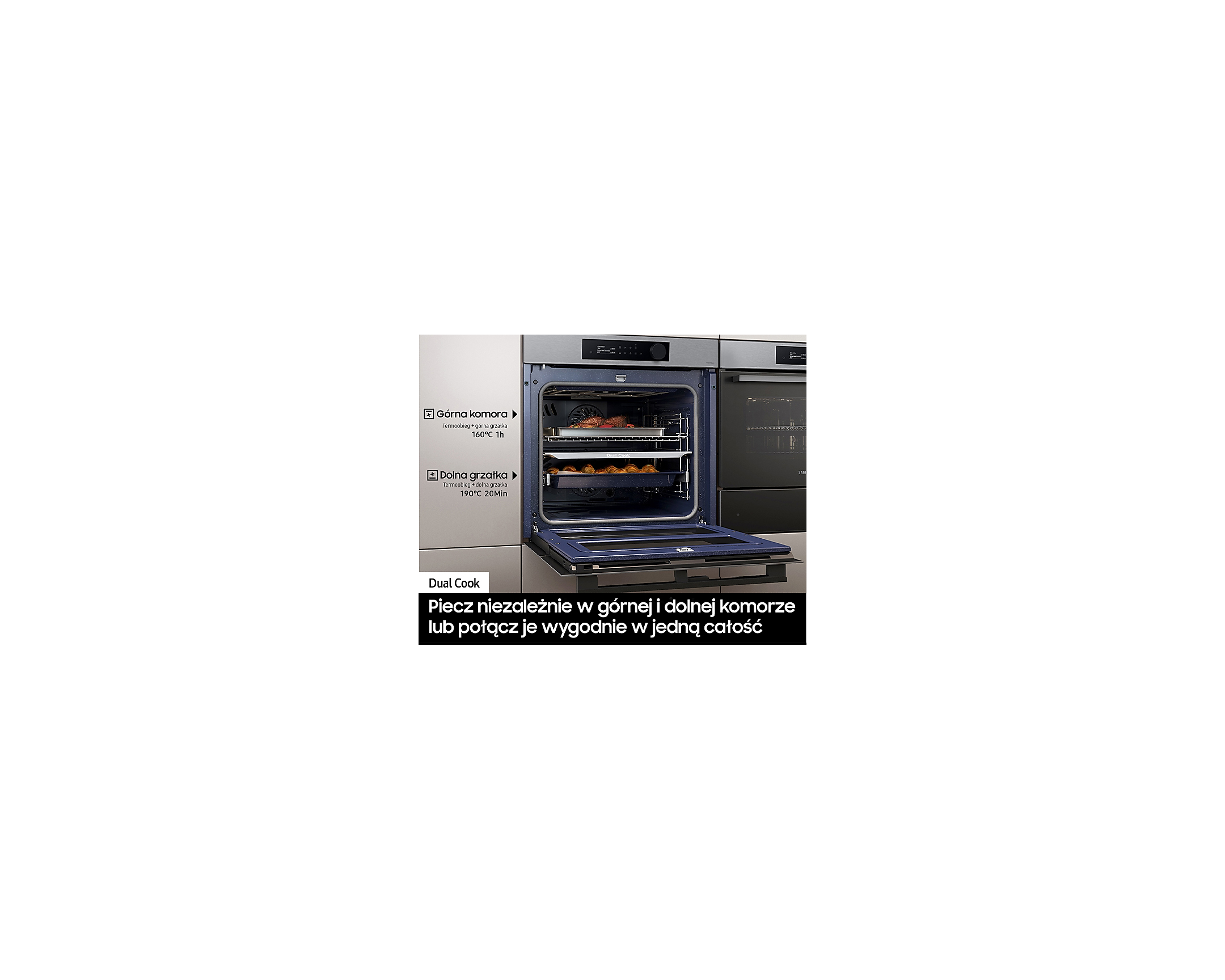Духовий шкаф Samsung NV7B5745PAS/U2 – це ваш ідеальний помічник на кухні, що поєднує в собі сучасні технології та елегантний дизайн. Однією з ключових функцій є Dual Cook Flex, що дозволяє розділити внутрішній простір на дві незалежні зони для одночасного приготування різних страв. Це забезпечує гнучкість у приготуванні, оскільки ви можете використовувати лише верхню зону для менших страв або обидві зони для великих страв.