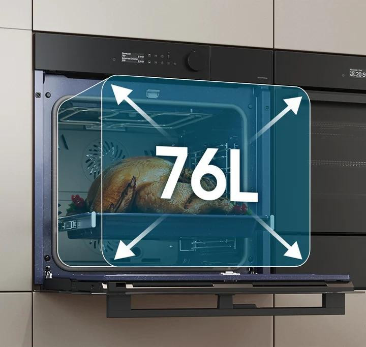 Духовка електрична DUAL COOK Samsung NV7B5785KAK стане ідеальним помічником у сучасній кухні. Завдяки потужності 3650 Вт (230 В) – 3950 Вт (240 В), ви зможете приготувати страви зі значно швидшим підігрівом. Об'єм духовки складає 76 л, що забезпечує достатньо місця для випікання навіть великих страв.