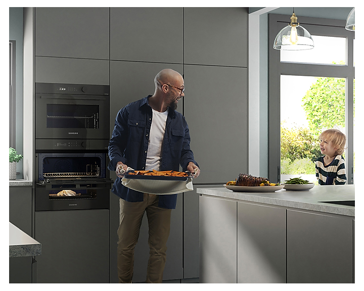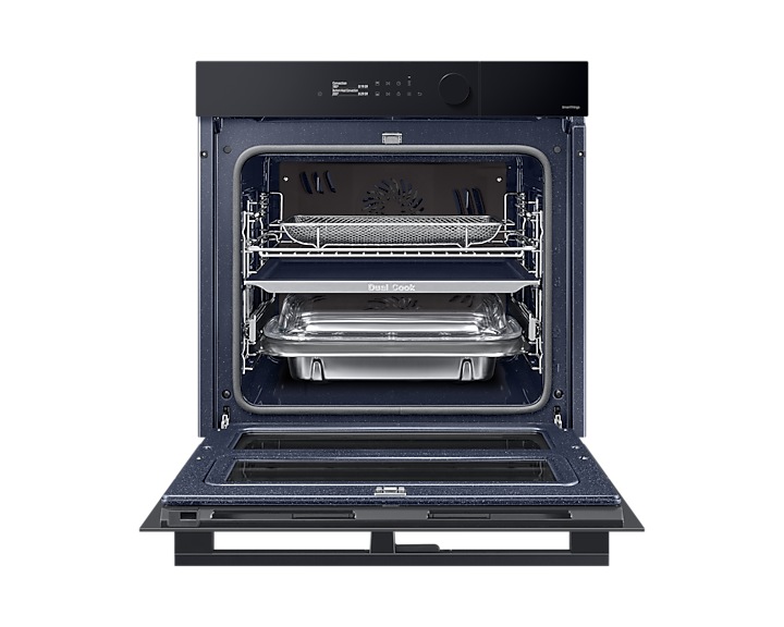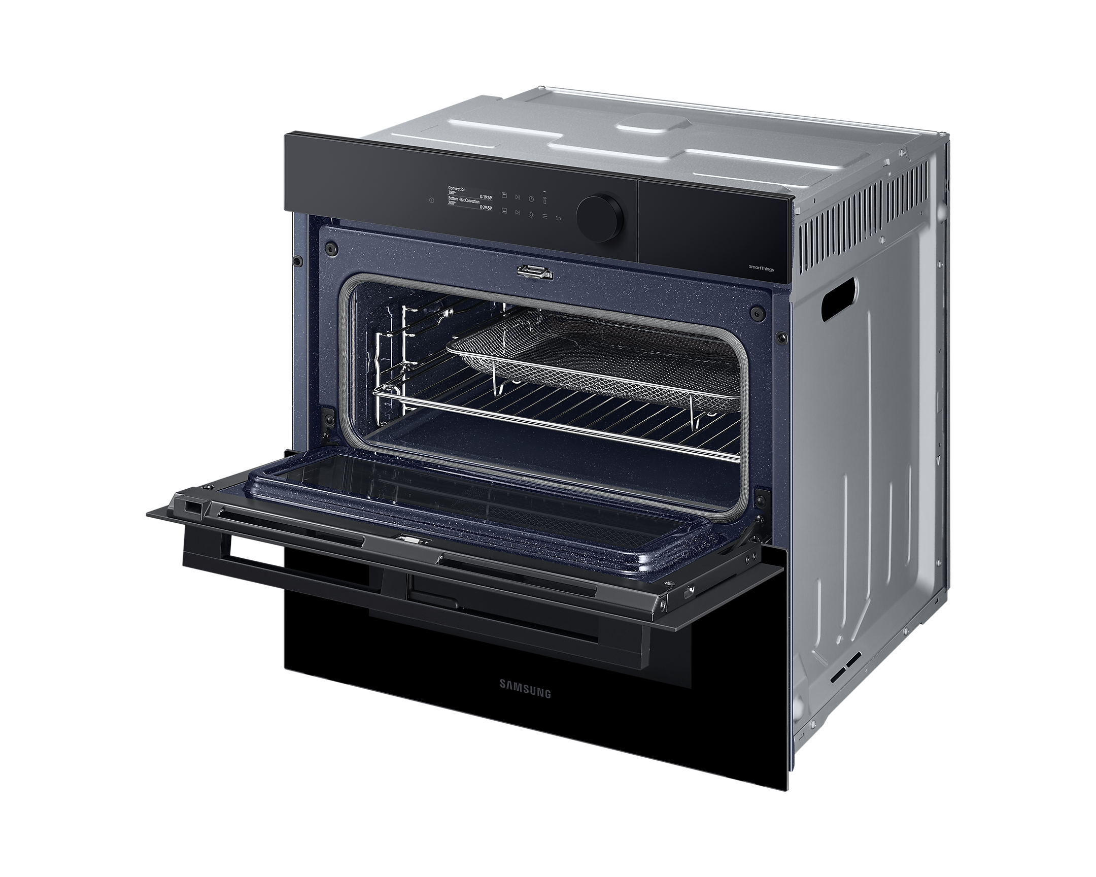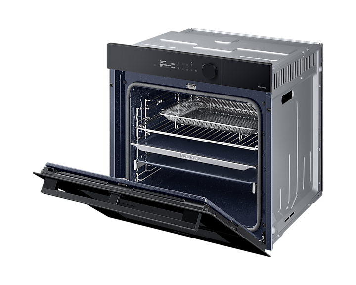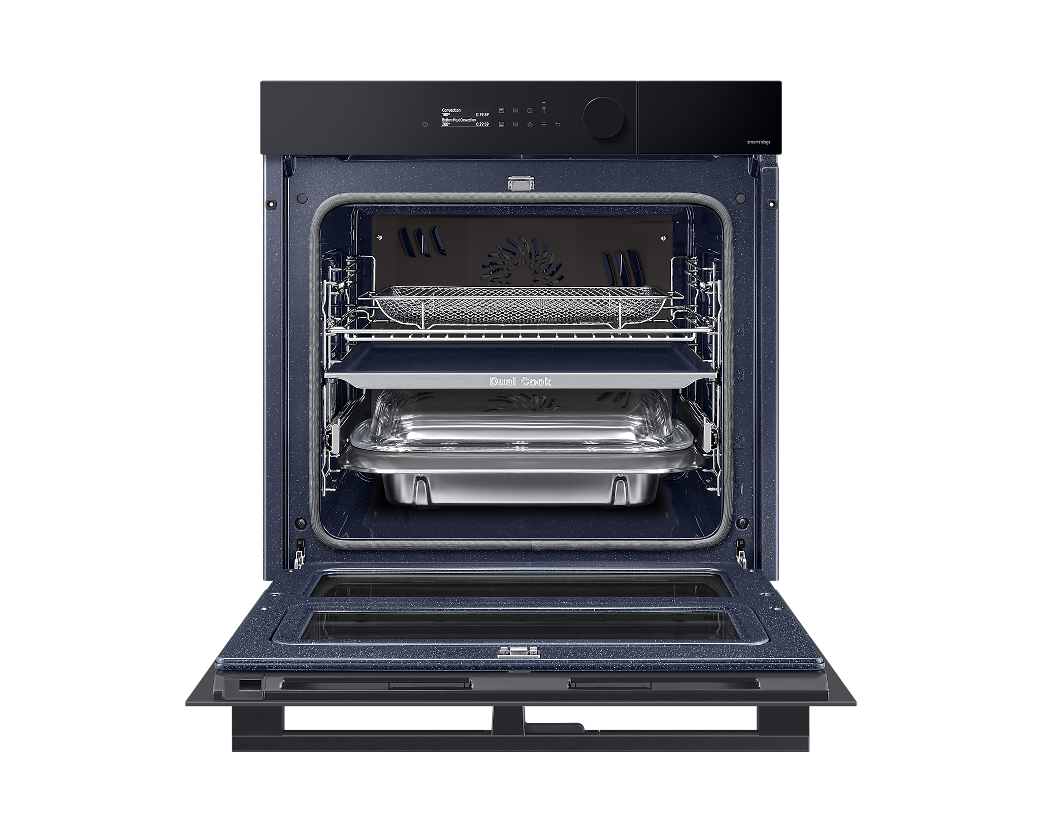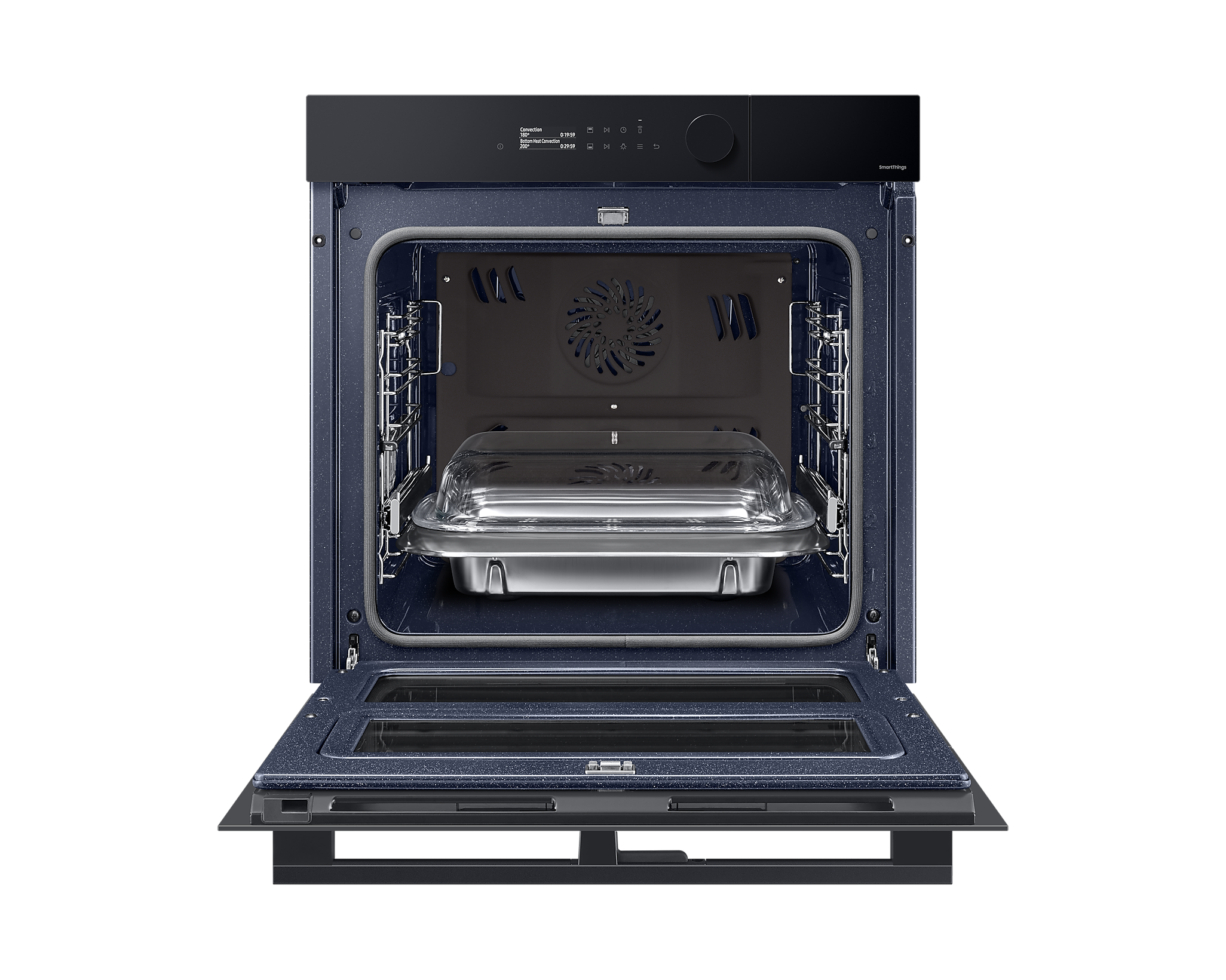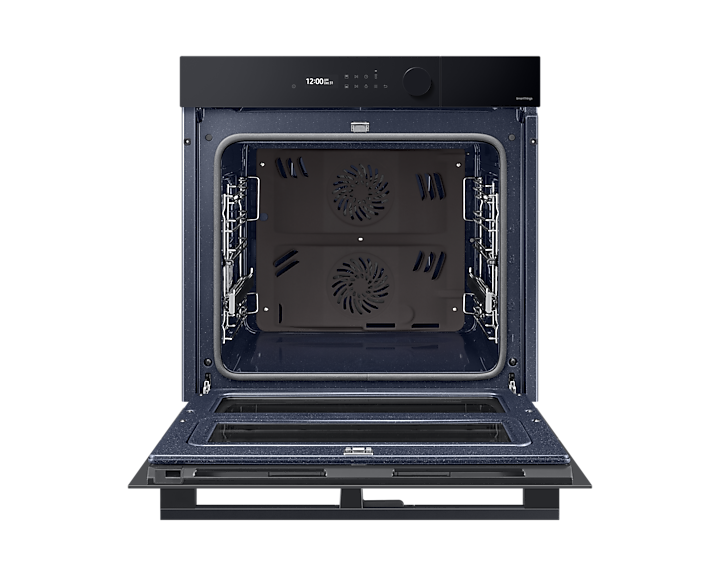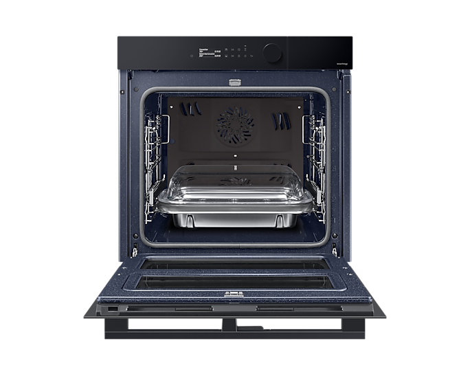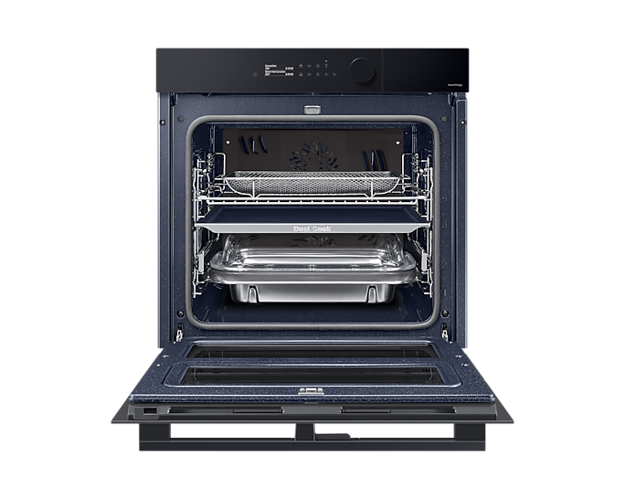 Об'єм духовки становить 76 літрів, що дозволяє готувати навіть великі страви, такі як індик. Додаткові телескопічні направляючі роблять процес виймання підносів легким та безпечним. Завдяки Wi-FiSmartThings, ви зможете контролювати процес приготування зі свого смартфона, плануючи меню на тиждень і отримуючи рекомендації рецептів.
