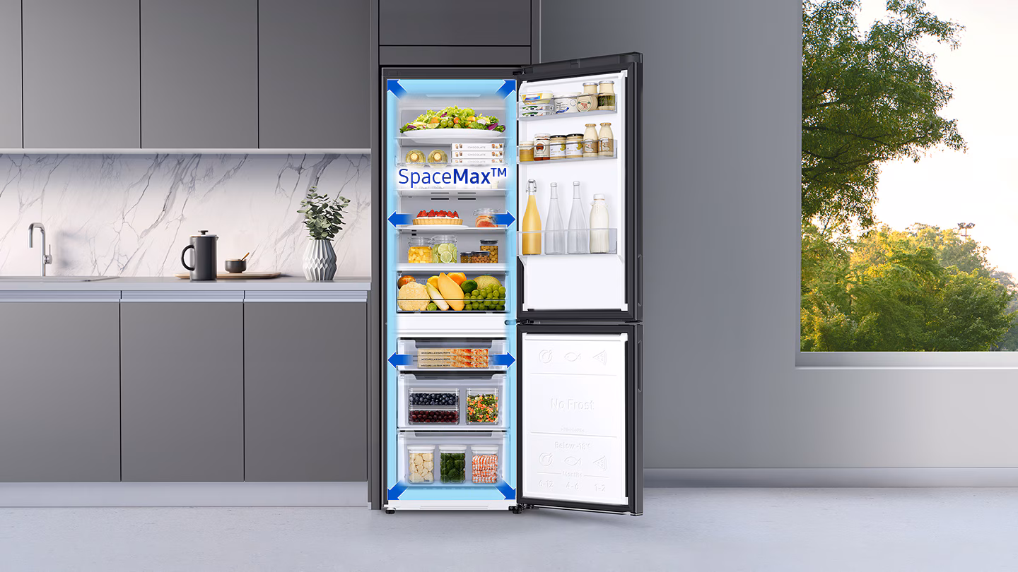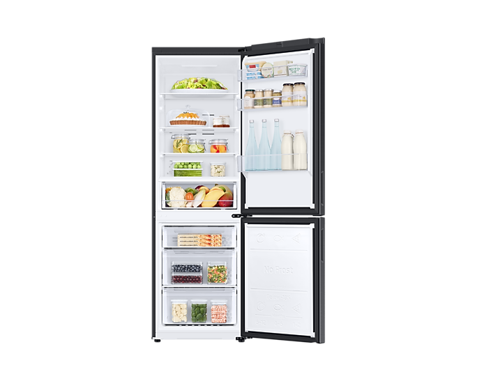 Ознайомтеся з холодильником Samsung RB33B610FBN/EF, який поєднує в собі стильний дизайн та передові технології. Ця модель має загальну брутто-ємність 344 літри, що забезпечує достатньо місця для зберігання продуктів. Холодильник розділений на дві секції: блискуча холодильна камера об’ємом 230 літрів та потужна заморожувальна камера на 114 літрів.