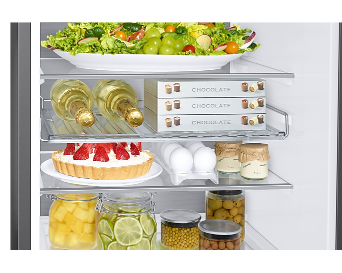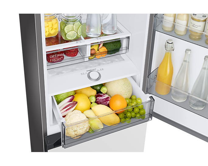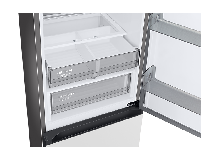 Крім того, холодильник обладнаний двома шухлядами для овочів, а також має шухляду Humidity Fresh для збереження овочів і фруктів. Зовнішній вигляд моделі вражає елегантним кольором і сучасним дизайном дверей BESPOKE.