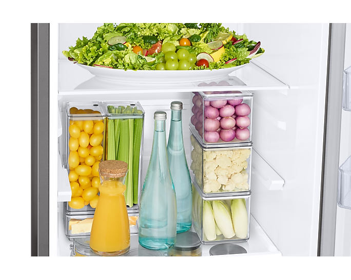 Внутрішній простір холодильника організований максимально зручно: у ньому є четверо поличок та одна шухляда для зберігання овочів і фруктів. Для зручності, ви знайдете три контейнера у дверях та половину полички для зберігання великих предметів, а також світлодіодне освітлення для кращої видимості.