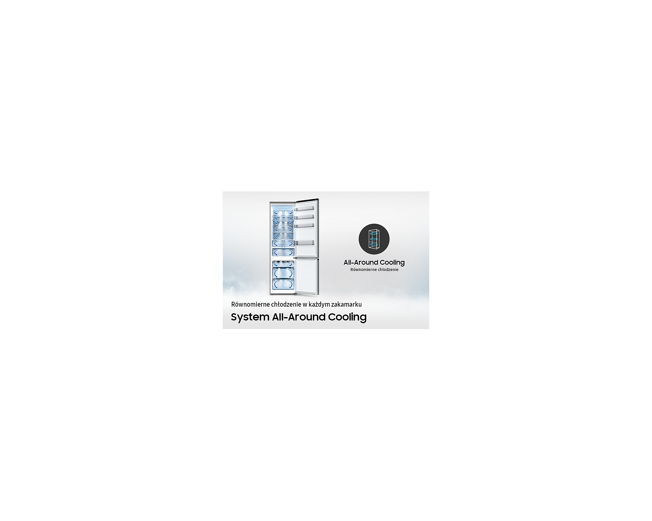 Технологія All-Around Cooling рівномірно розподіляє холодне повітря по всій площі холодильника, що гарантує стабільну температуру в кожному куточку.