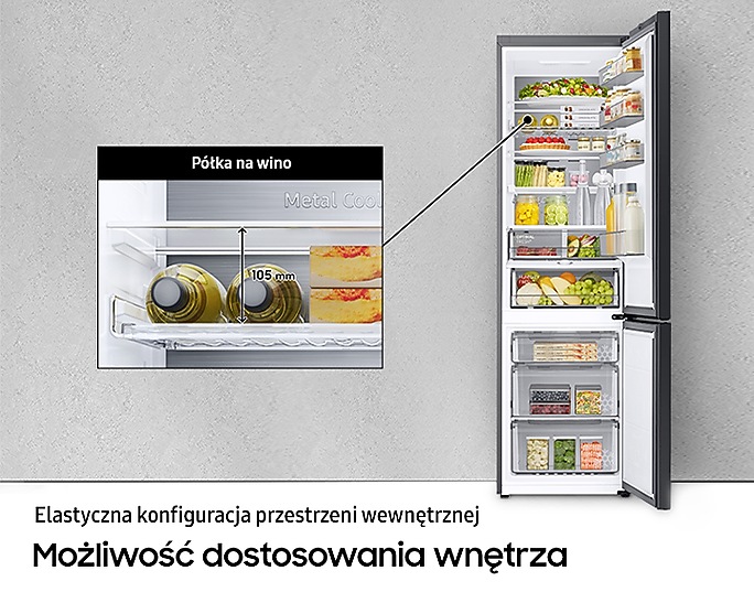 Створений з високоякісних матеріалів, холодильник оснащений пяти скляними полицями, однією шухлядою для овочів, а також п'ятьма контейнерами у дверях для зручності використання. Для зберігання вина також передбачена спеціальна півка для вина.