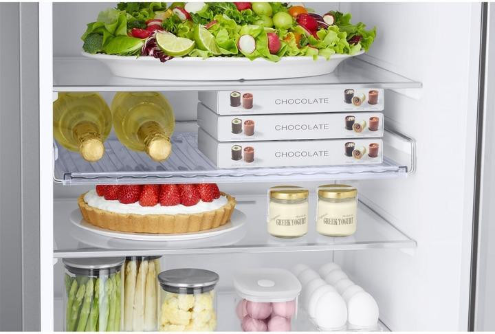 Інверторний компресор працює тихо (до 37 дБ) та економно, споживаючи всього 320 кВт-год енергії на рік, що відповідає класу енергоспоживання A+. Особливою перевагою є режим SmartThings AI Energy, який автоматично оптимізує роботу компресора, заощаджуючи до 10% електроенергії. Додаткова холодильна зона Optimal Fresh+ дозволяє зберігати м'ясо, рибу, овочі та фрукти в ідеальному температурному режимі.