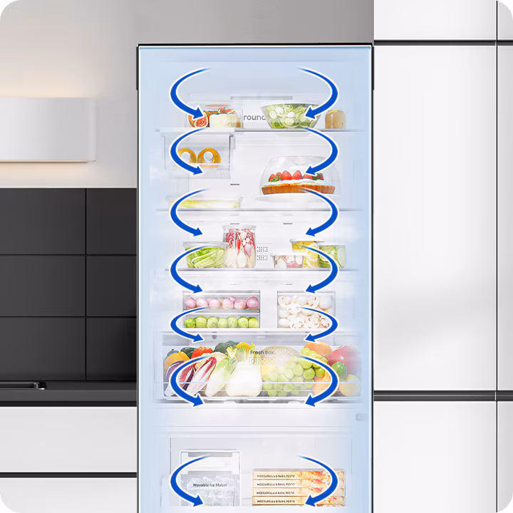 Для зручності використання у холодильнику передбачені **4 полки**, з яких одна складається, а також **5 контейнерів у дверях**. Технологія **Power Cool** миттєво охолоджує продукти, а **Power Freeze** – швидко заморожує їх, що є важливим при зберіганні свіжих продуктів. Однією з переваг є **вбудована система охолодження**, що забезпечує оптимальні умови для зберігання їжі.